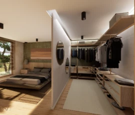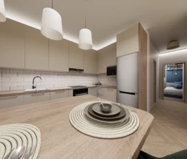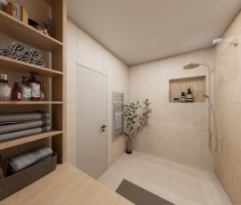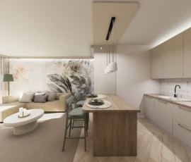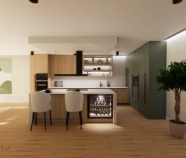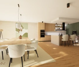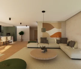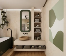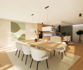 Ez a lakás, egy különleges Japandi stílusú enteriőr enyhe wabi-sabi érzülettel, természetes anyagokkal és nyugodt, harmonikus térszervezéssel. Alacsony, horizontális bútorarányok, természetes anyagdominancia – fa, textúrált falak, len és kőhatás. Földszín alapú színpaletta zöld hangsúllyal. Mindez pihentető otthoni atmoszférát teremt.