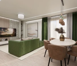 A lakásban megfigyelhető a 70-20-10 színszabály: a tér meghatározó háttere a natúr, világos bézs, ezt követi a zöld mint domináns karakter a textilekben, a kanapén és egyes bútorfrontokon, ezt egészíti ki egy barnába hajló terrakotta mint meleg hangsúlyszín.