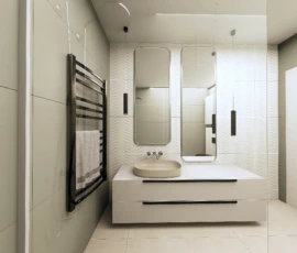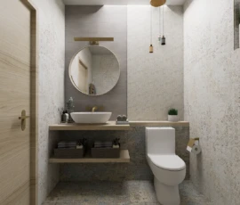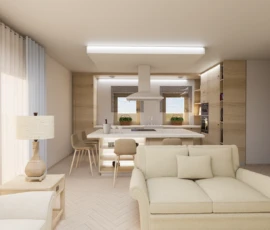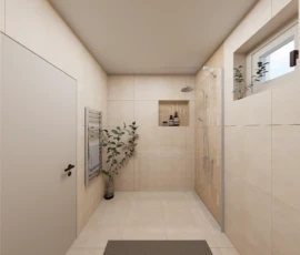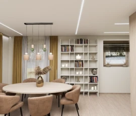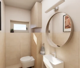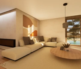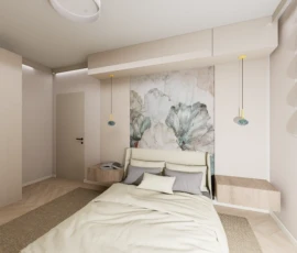 Lágy, púderes és meleg bézs tónusok, íves formák, akvarell hatású faldekorok és textúrák, puha fények és rétegzett világítás – mind harmonikus, nyugodt otthoni atmoszférát teremt.