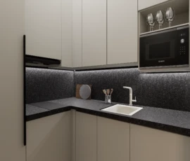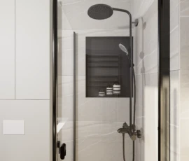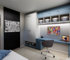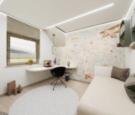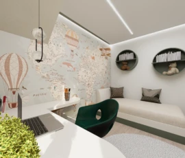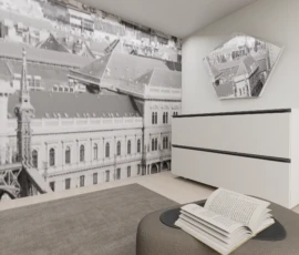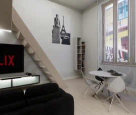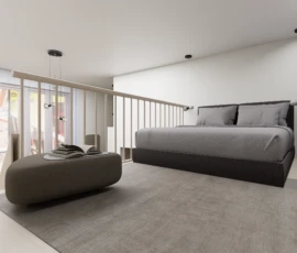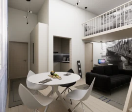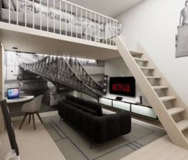 Egy budapesti belvárosi, nagy belmagasságú, így galériázható minigarzon egy egyedülálló 23 éves fiatalember kedvelt otthona. Mindössze 35 m²-en fontos volt az átgondolt térkihasználás, a jól elkülönített alvó- és nappali funkciók, miközben a tér vizuálisan nyitott marad. Modern városi stílus és monokróm színvilág jellemzi – karakteres grafikai posztertapéta teszi egyedivé az enteriőrt a monokróm színek és az egyszerű bútorzat ellenére.