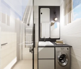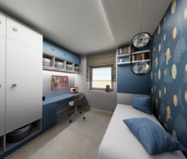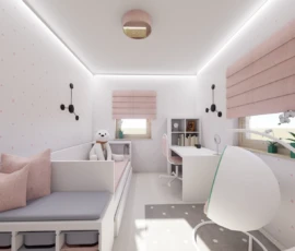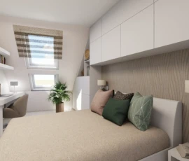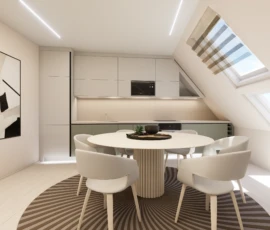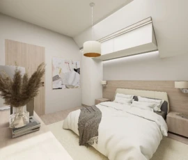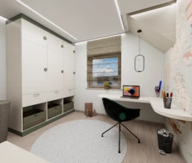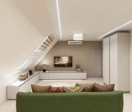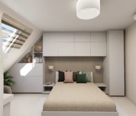 Megrendelőm tetőtéri lakásában a kérés a világos tónusú textúrák mellett az elegendő tárolótér kialakítása volt, esztétikusan. A tetőtéri adottságok és a csapott falsíkok tudatos térszervezést igényelnek. Igény volt egy dolgozósarok kialakítására is, amely a hálószoba ablaka alatt kapott helyet a tökéletes fényviszonyok miatt.