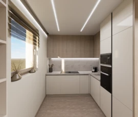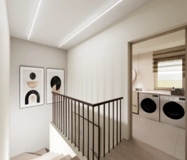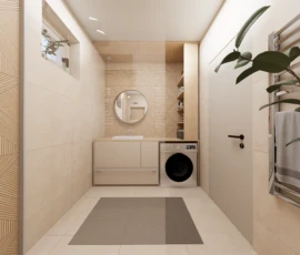 A kérés ebben az esetben egy jó hangulatú, praktikus otthon megteremtése volt. Ennek alapján született meg ez a terv, világos anyagokkal, finom földszínekkel és egyedileg tervezett bútorokkal a maximális térkihasználás érdekében.