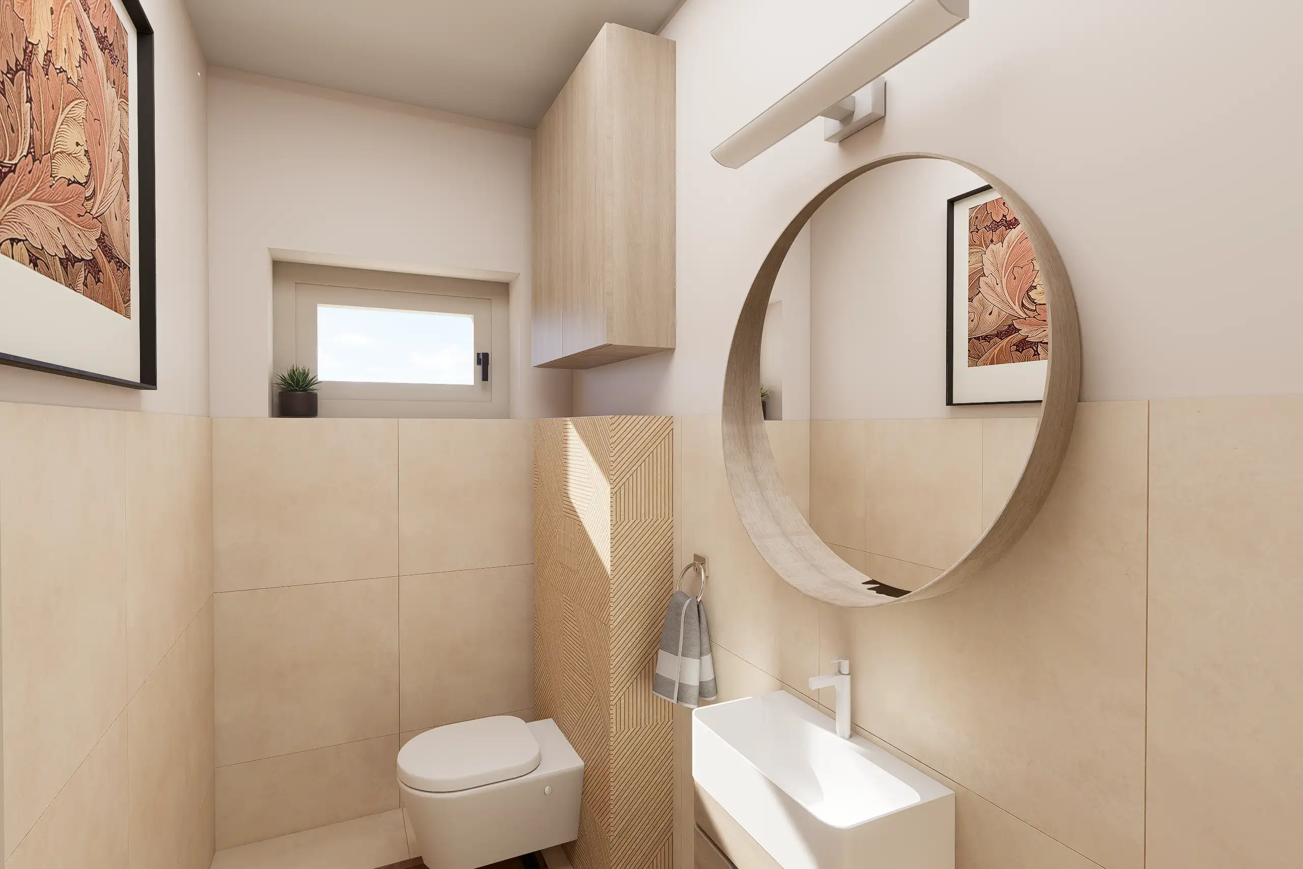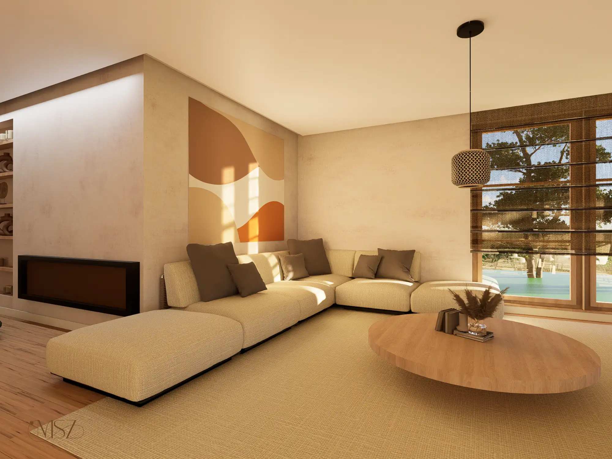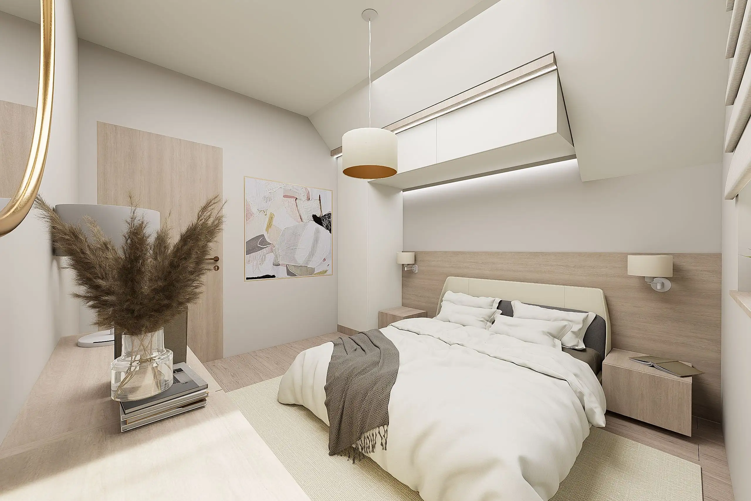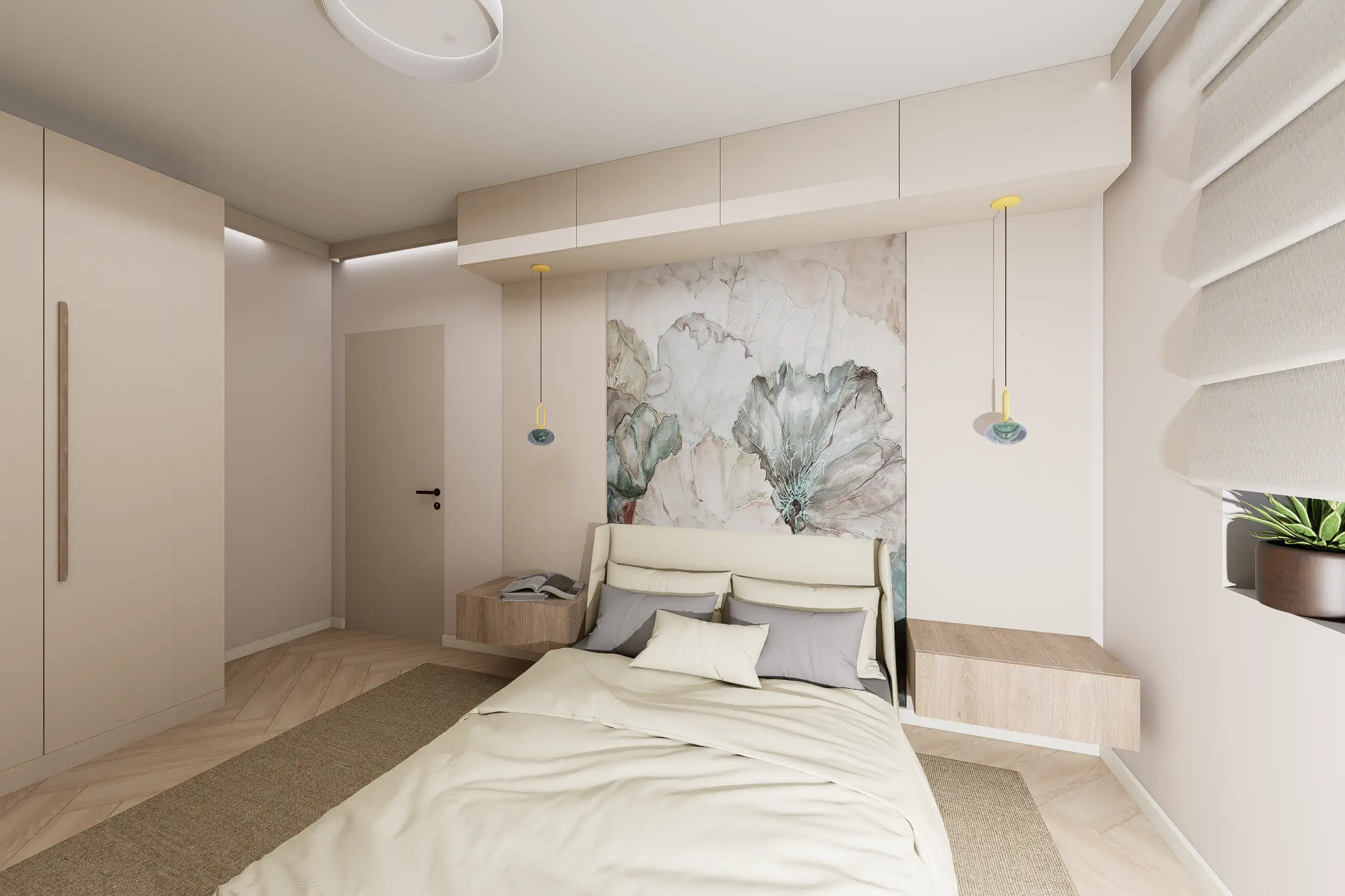Lágy, púderes és meleg bézs tónusok, íves formák, akvarell hatású faldekorok és textúrák, puha fények és rétegzett világítás – mind harmonikus, nyugodt otthoni atmoszférát teremt.