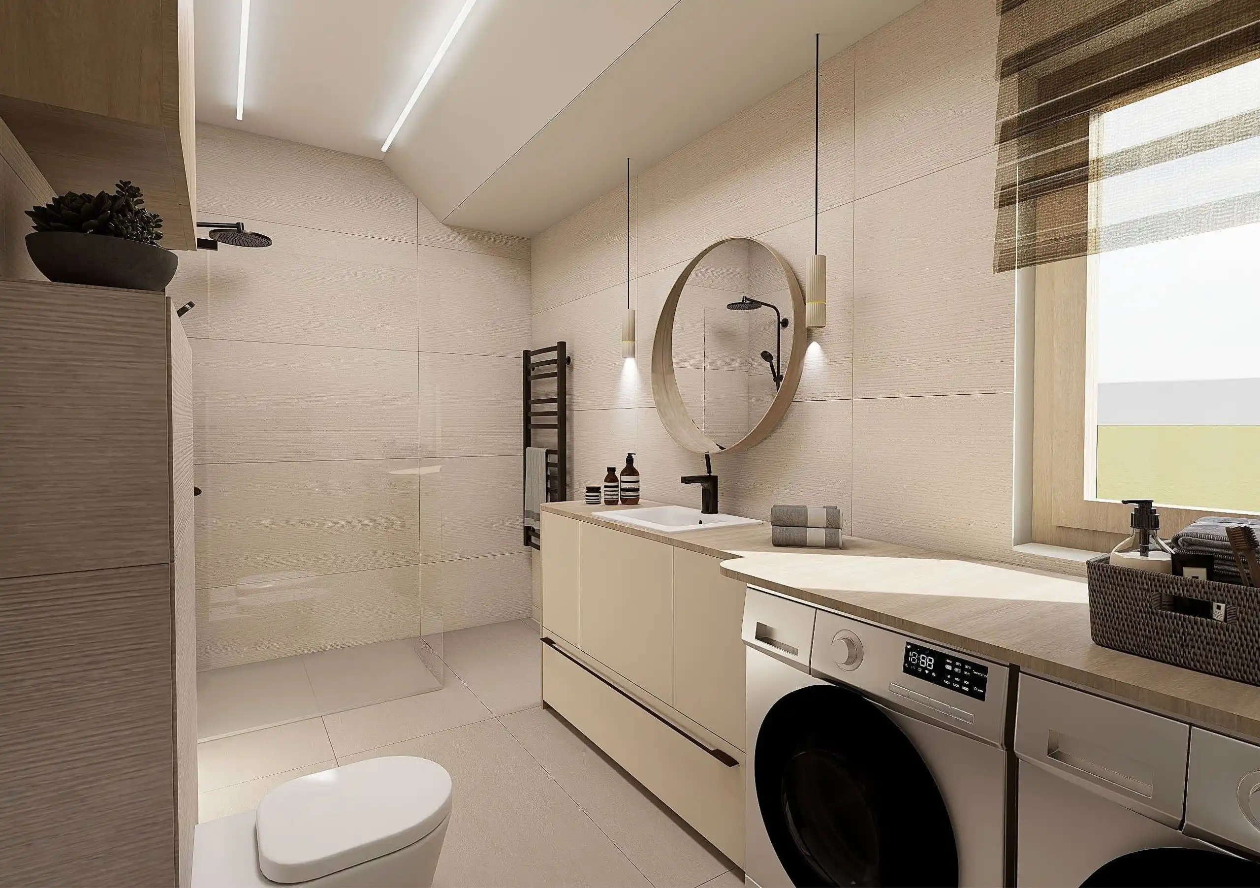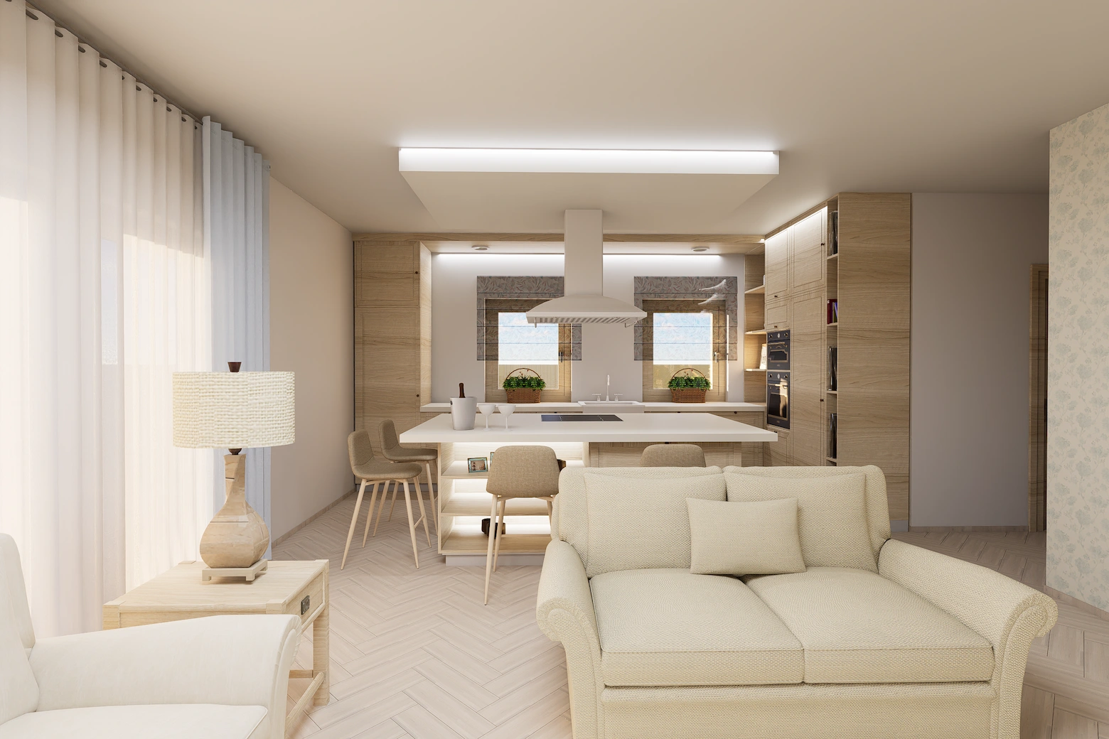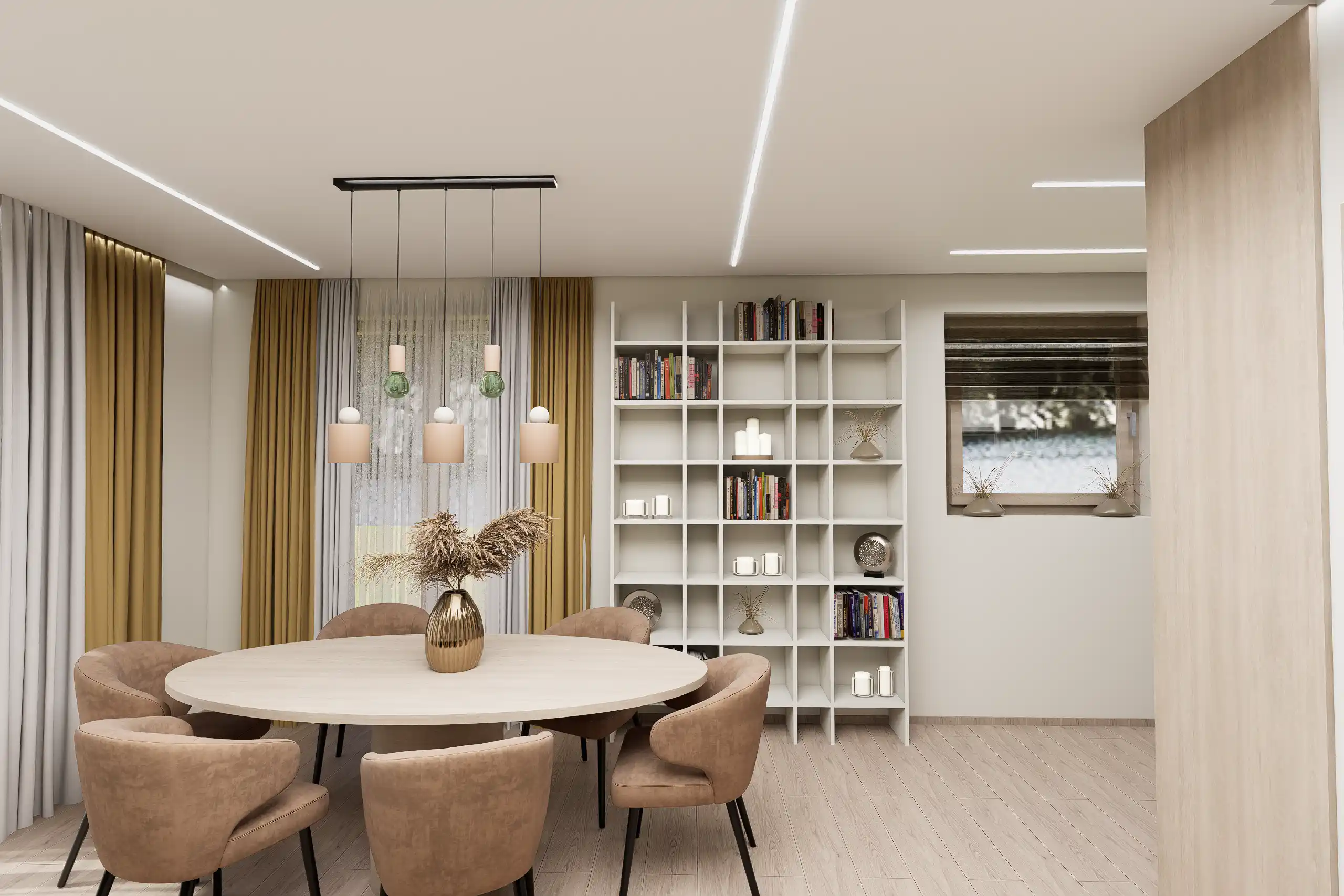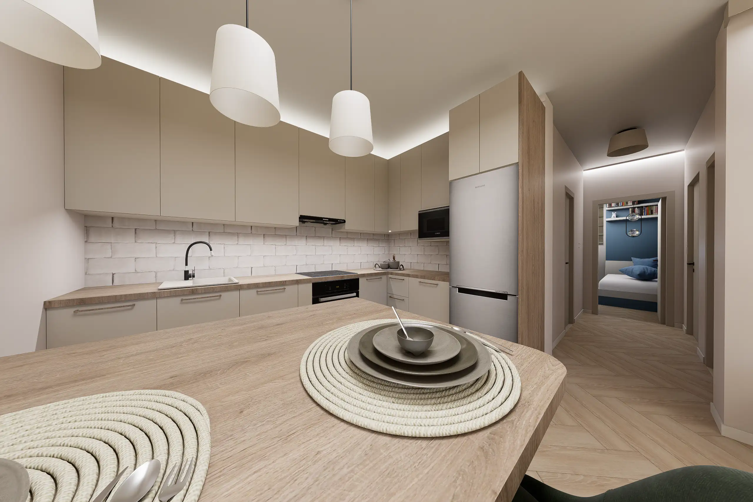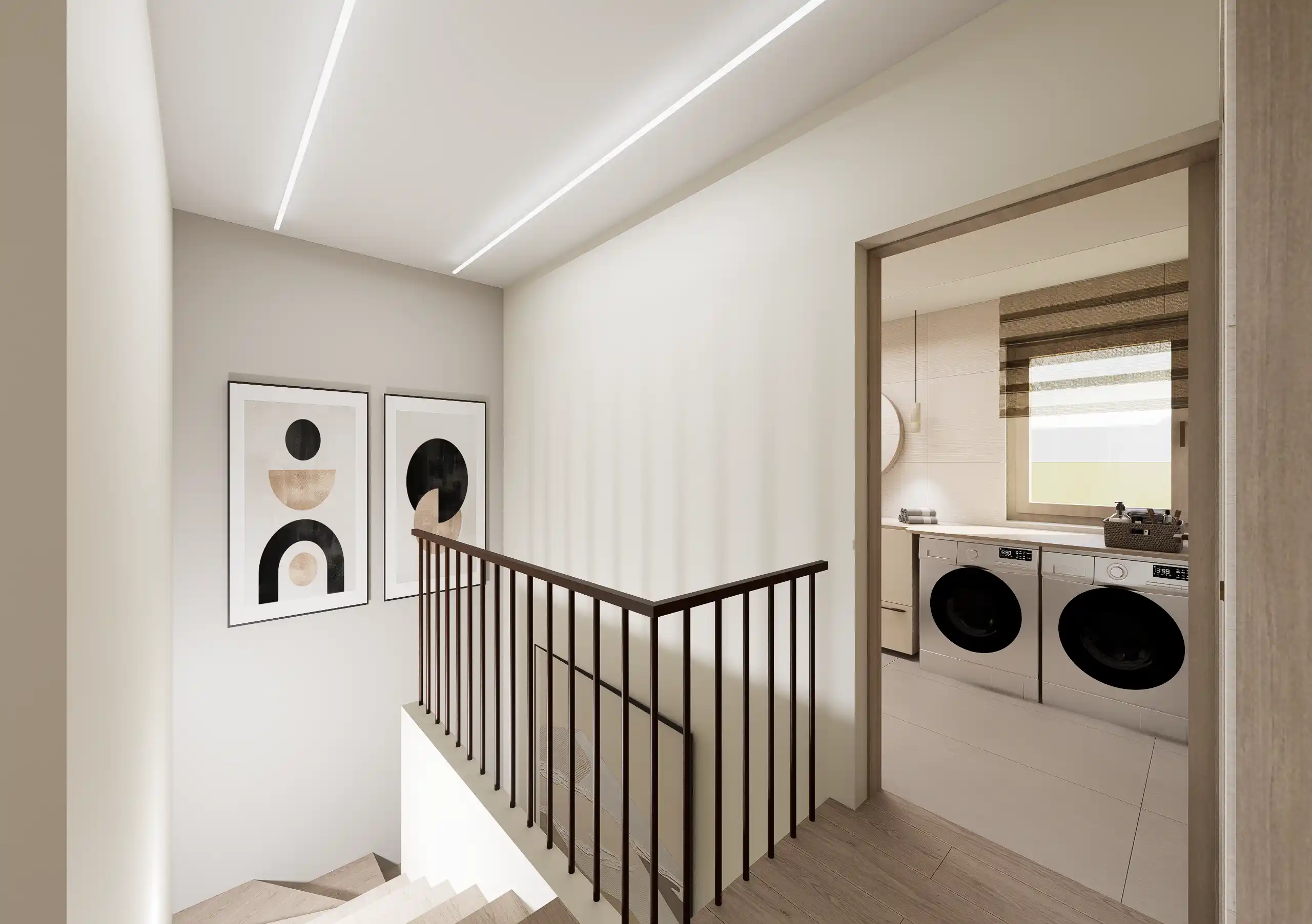 Lágy, púderes és meleg bézs tónusok, íves formák, akvarell hatású faldekorok és textúrák, puha fények és rétegzett világítás – mind harmonikus, nyugodt otthoni atmoszférát teremt.