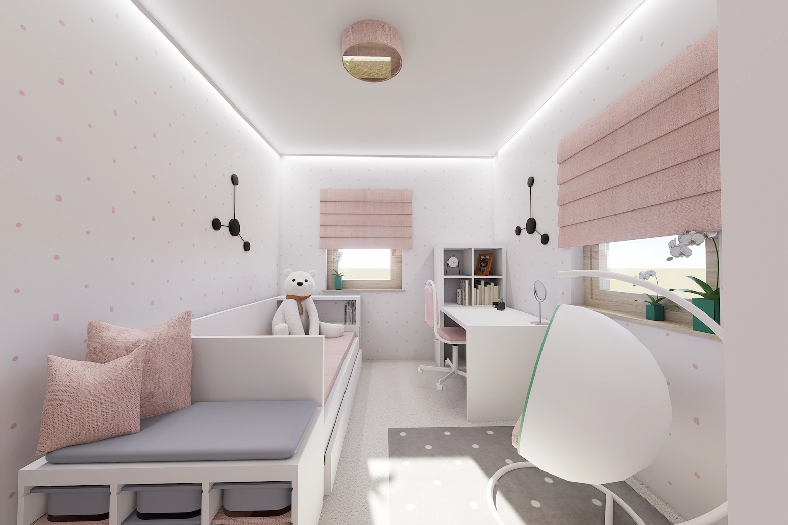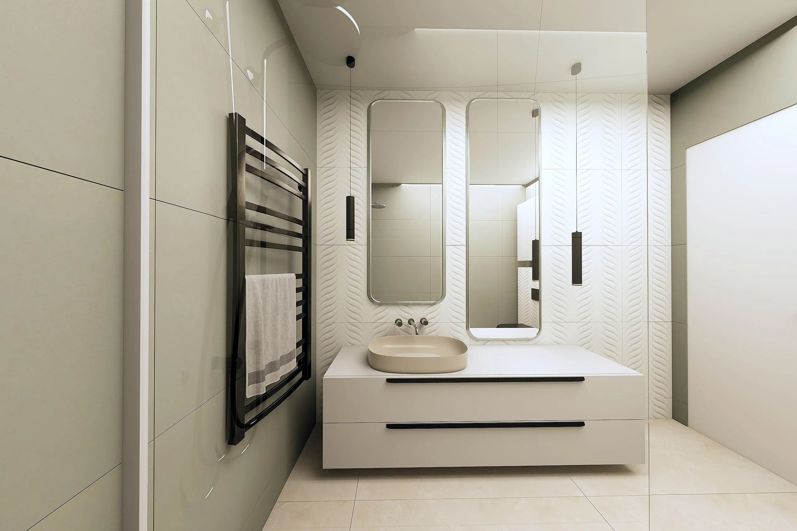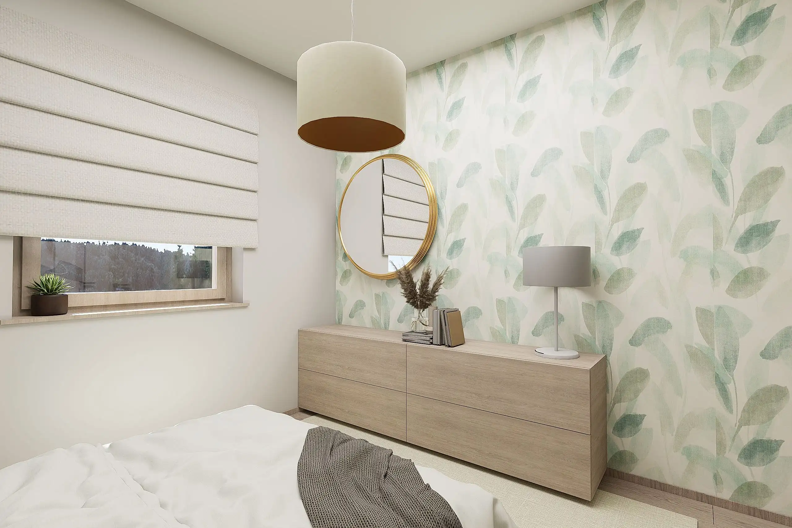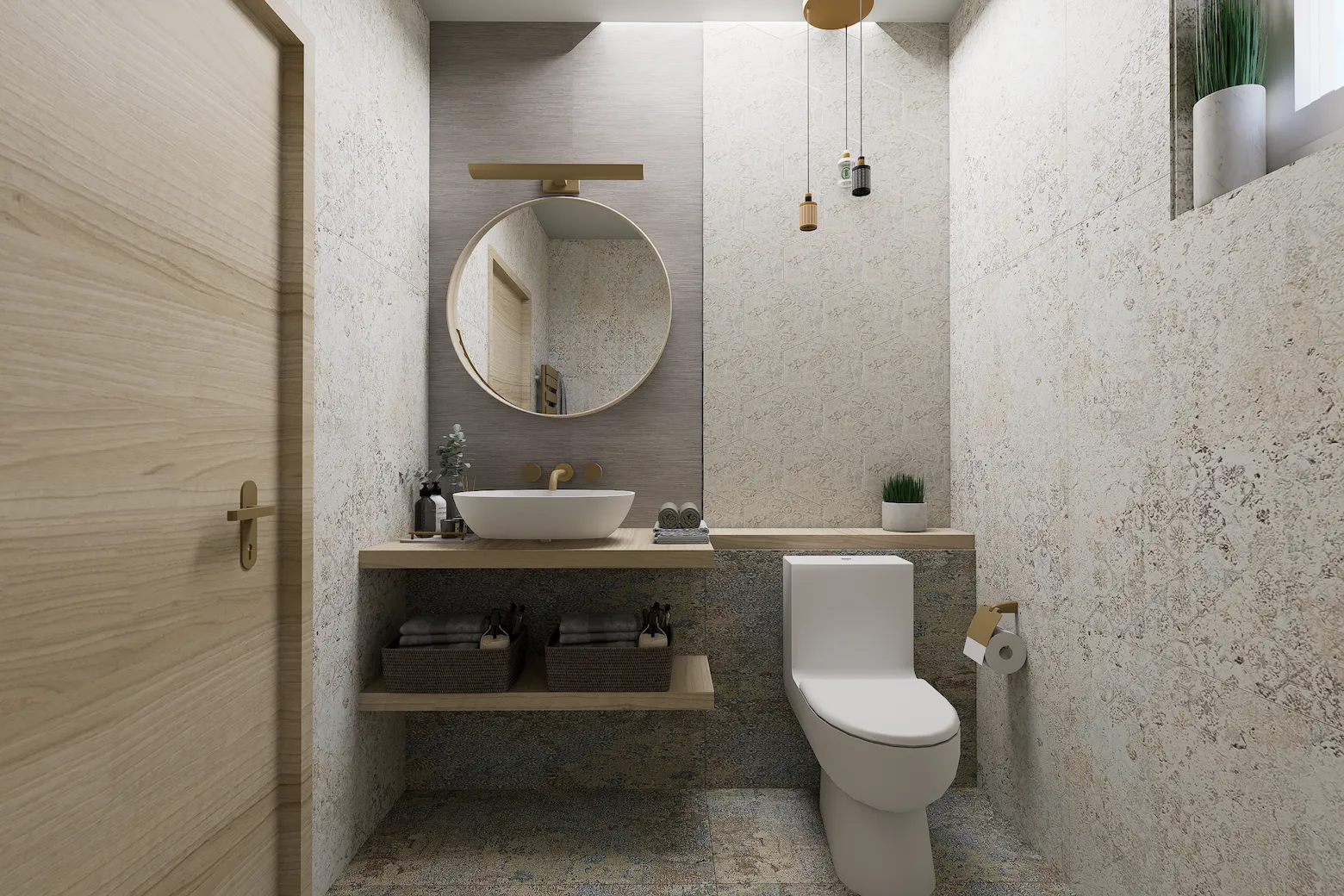 Lágy, púderes és meleg bézs tónusok, íves formák, akvarell hatású faldekorok és textúrák, puha fények és rétegzett világítás – mind harmonikus, nyugodt otthoni atmoszférát teremt.