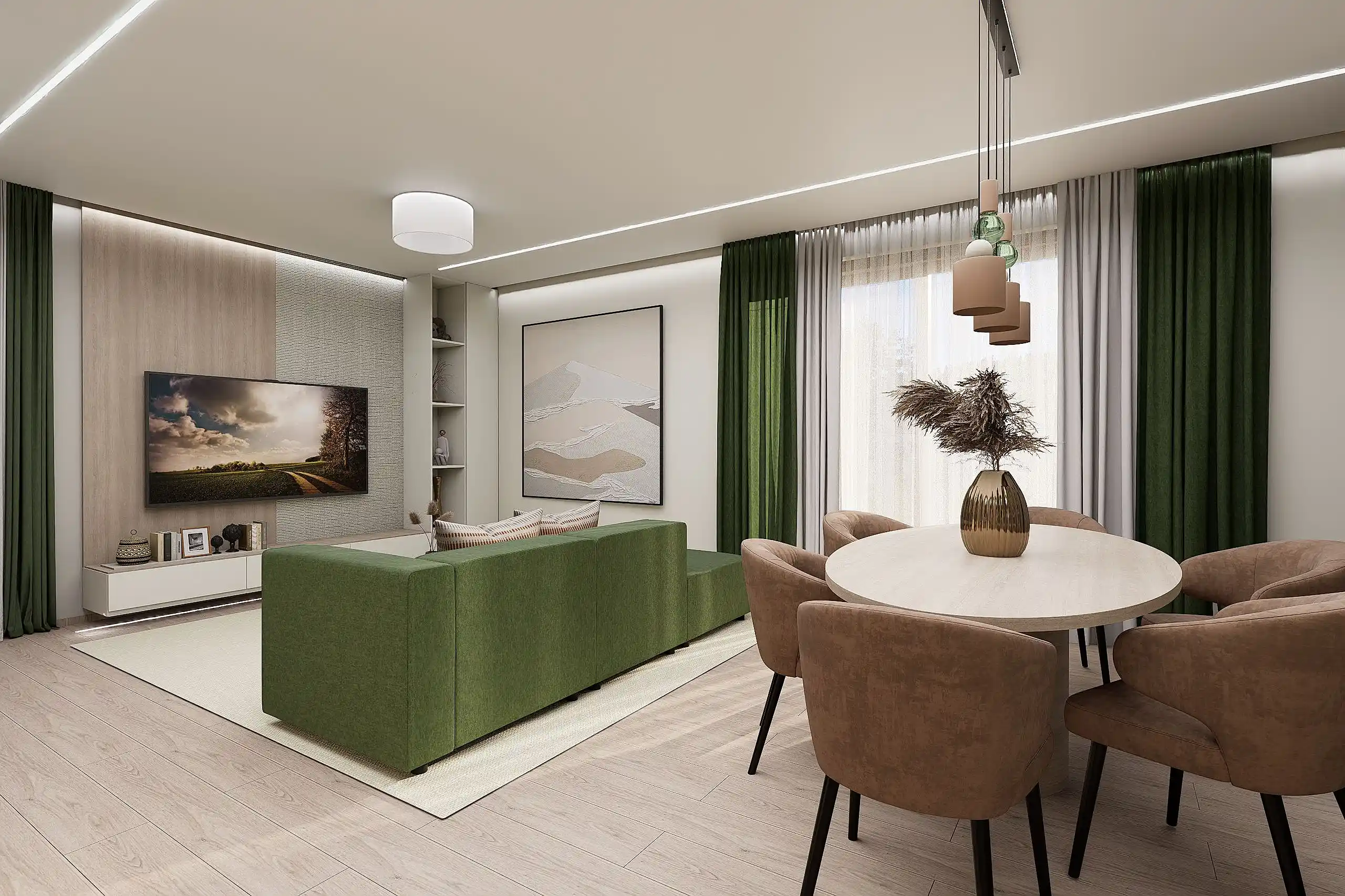 A lakásban megfigyelhető a 70-20-10 színszabály: a tér meghatározó háttere a natúr, világos bézs, ezt követi a zöld mint domináns karakter a textilekben, a kanapén és egyes bútorfrontokon, ezt egészíti ki egy barnába hajló terrakotta mint meleg hangsúlyszín.
