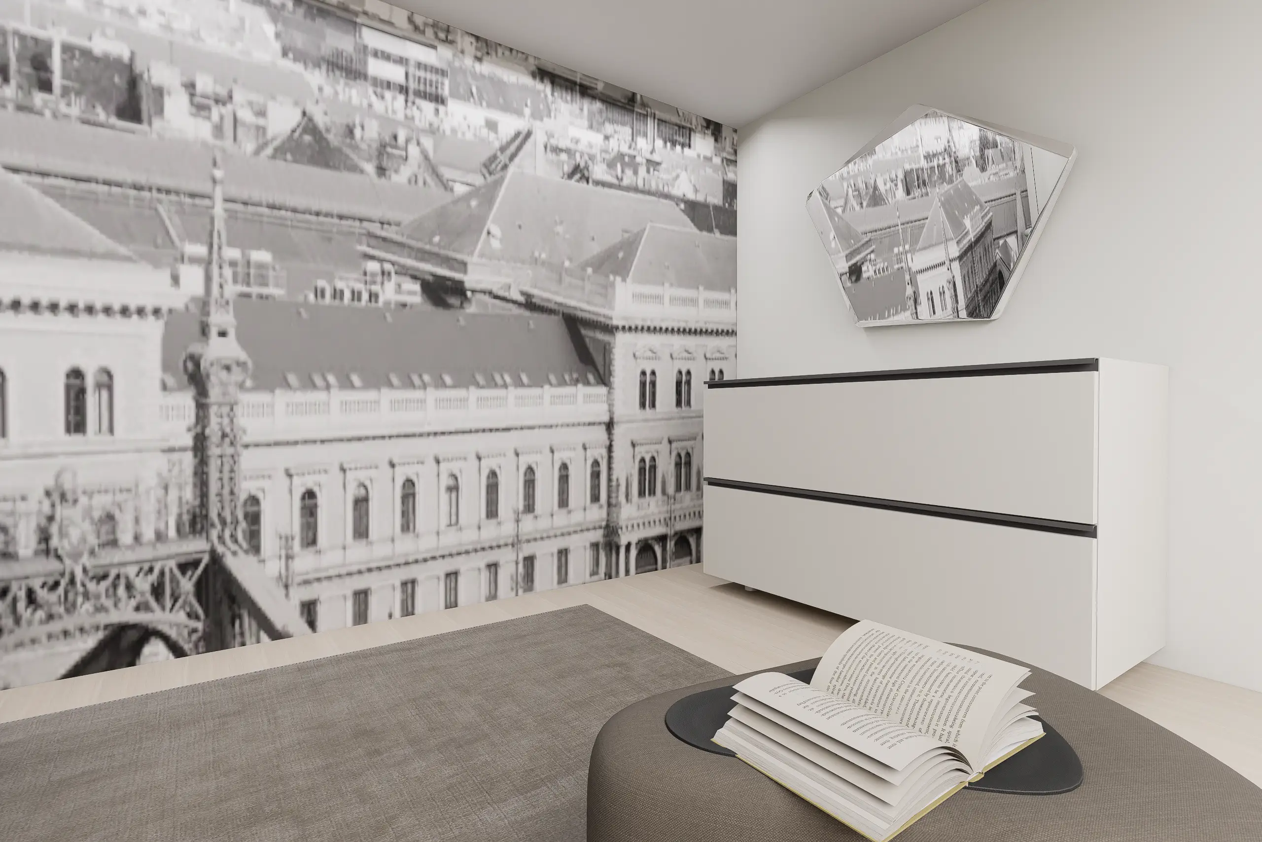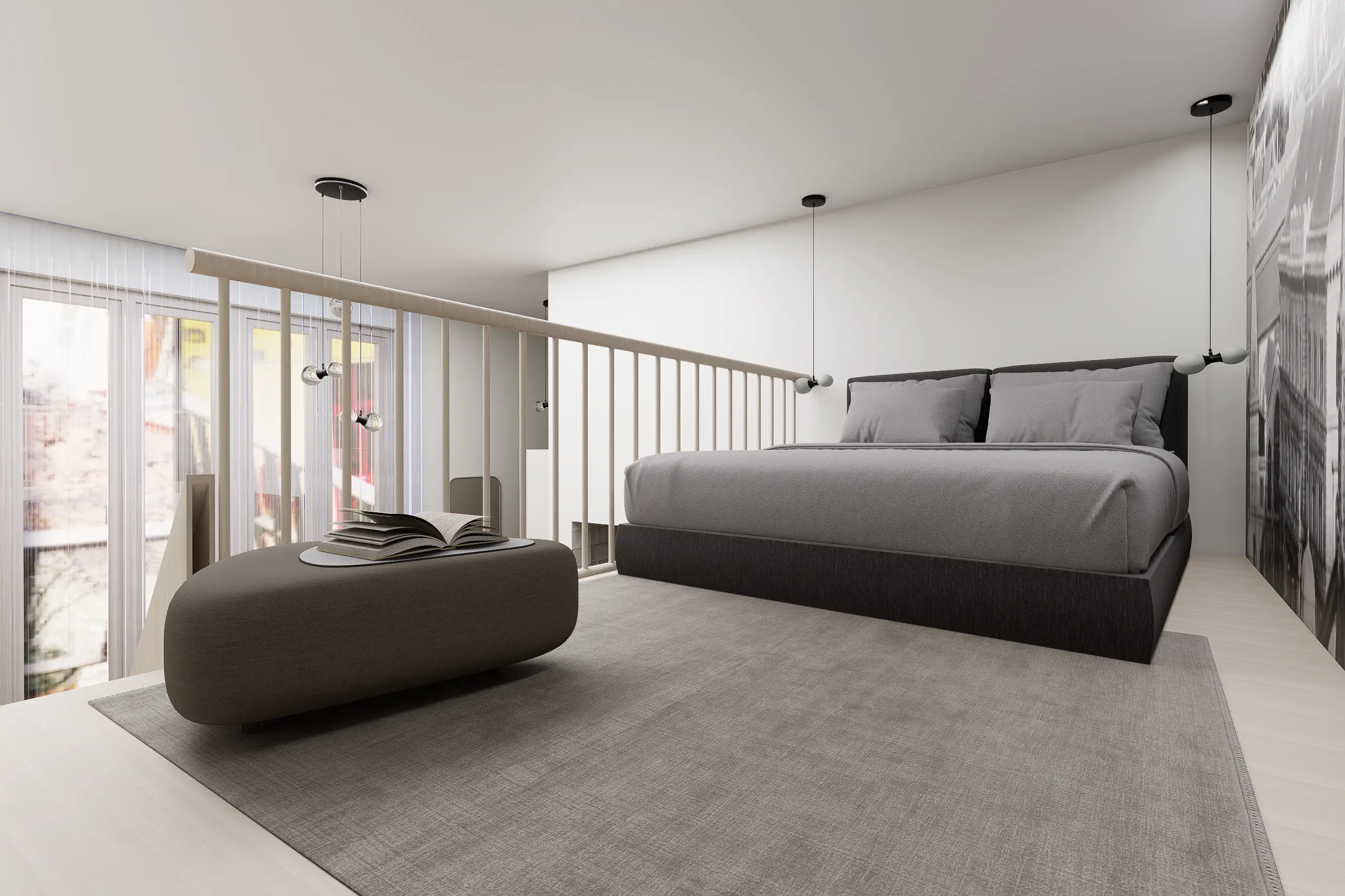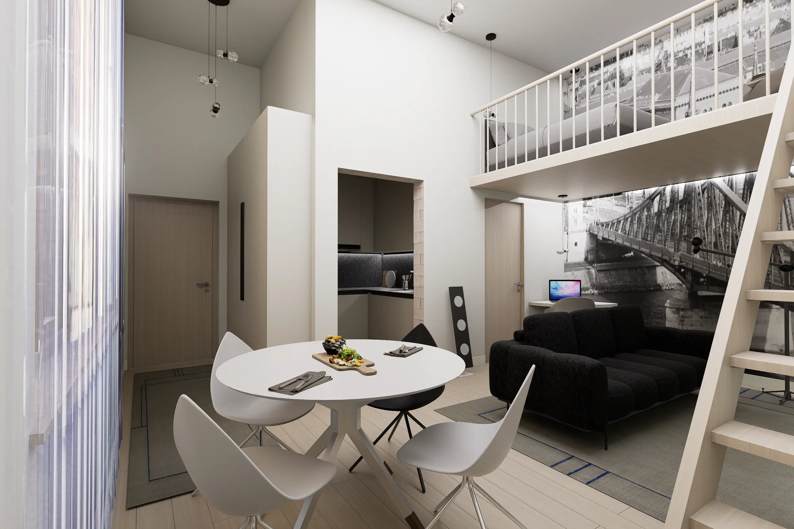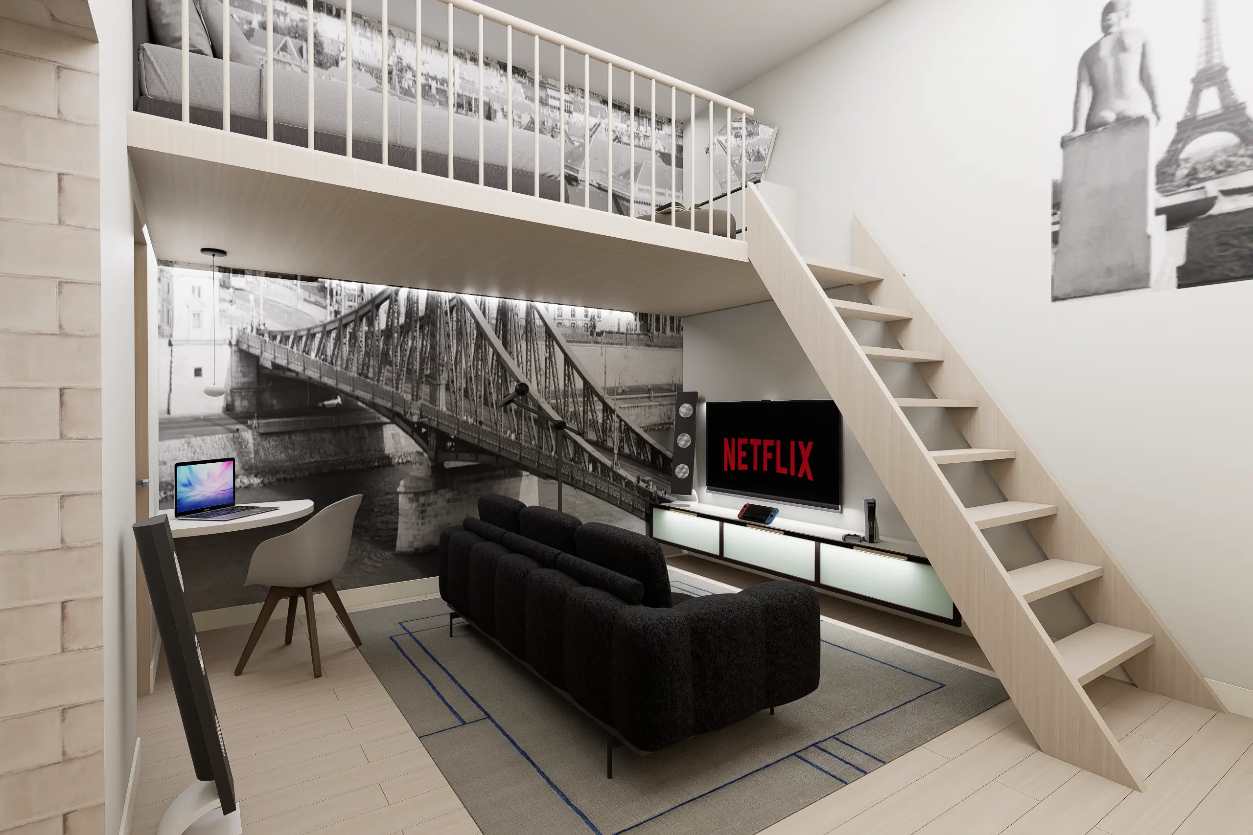Egy budapesti belvárosi, nagy belmagasságú, így galériázható minigarzon egy egyedülálló 23 éves fiatalember kedvelt otthona. Mindössze 35 m²-en fontos volt az átgondolt térkihasználás, a jól elkülönített alvó- és nappali funkciók, miközben a tér vizuálisan nyitott marad. Modern városi stílus és monokróm színvilág jellemzi – karakteres grafikai posztertapéta teszi egyedivé az enteriőrt a monokróm színek és az egyszerű bútorzat ellenére.