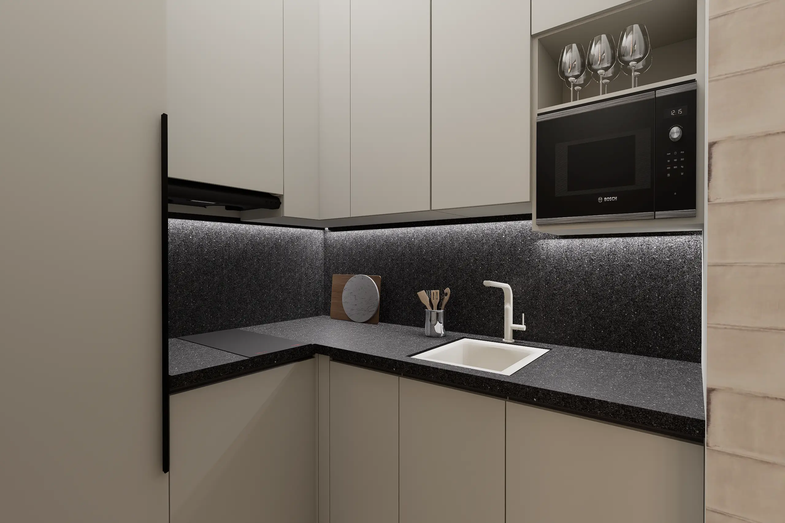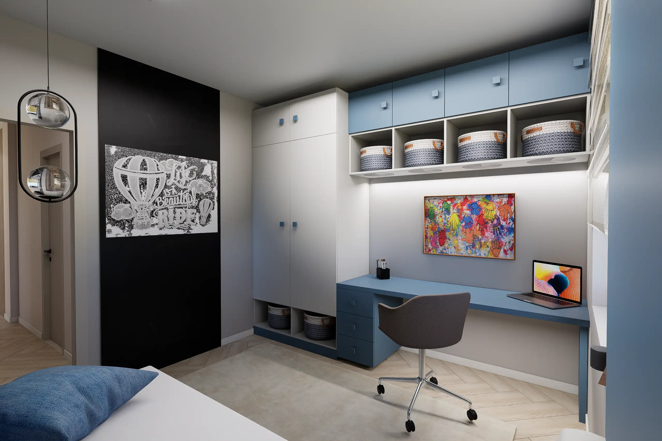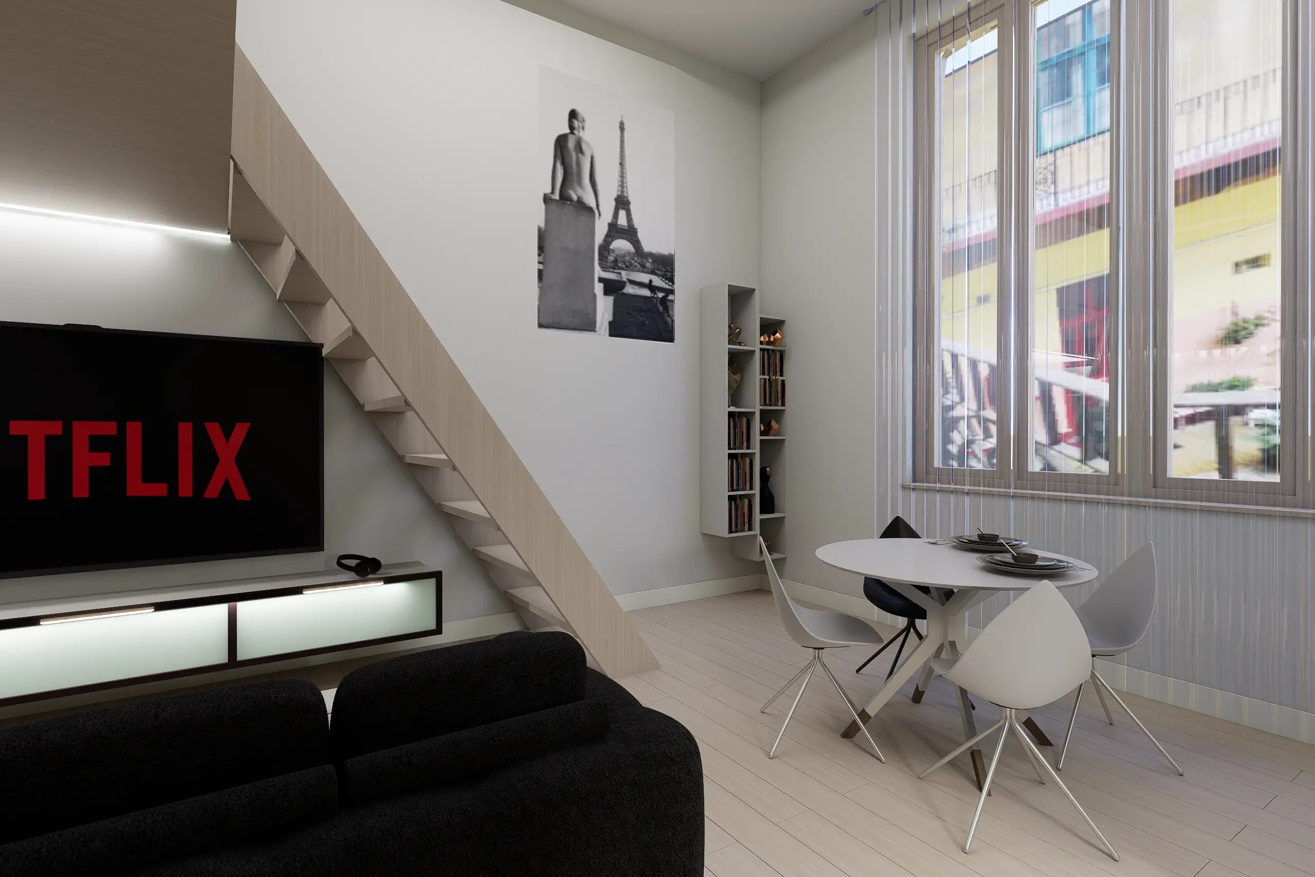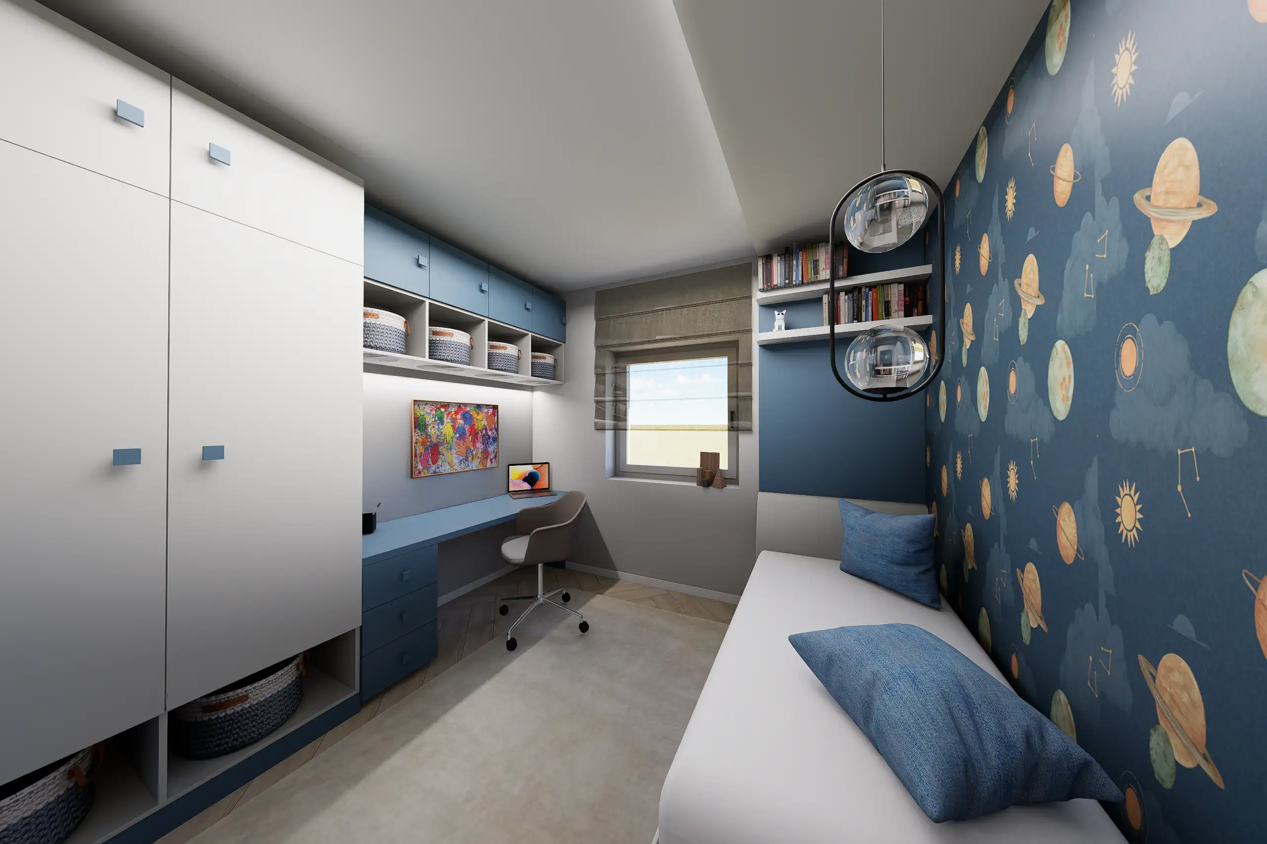 Egy budapesti belvárosi, nagy belmagasságú, így galériázható minigarzon egy egyedülálló 23 éves fiatalember kedvelt otthona. Mindössze 35 m²-en fontos volt az átgondolt térkihasználás, a jól elkülönített alvó- és nappali funkciók, miközben a tér vizuálisan nyitott marad. Modern városi stílus és monokróm színvilág jellemzi – karakteres grafikai posztertapéta teszi egyedivé az enteriőrt a monokróm színek és az egyszerű bútorzat ellenére.