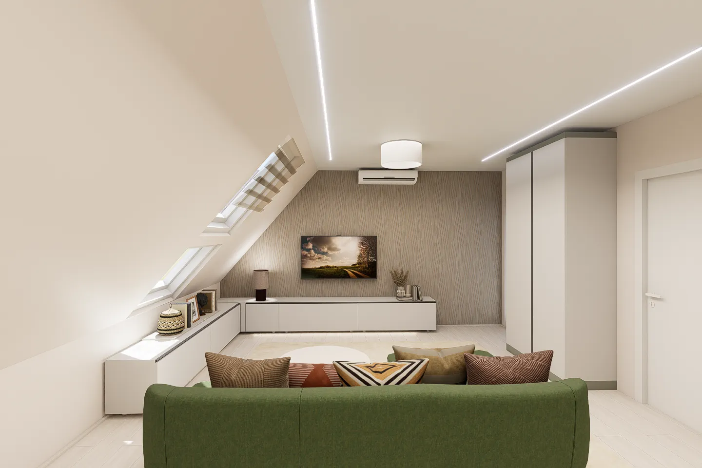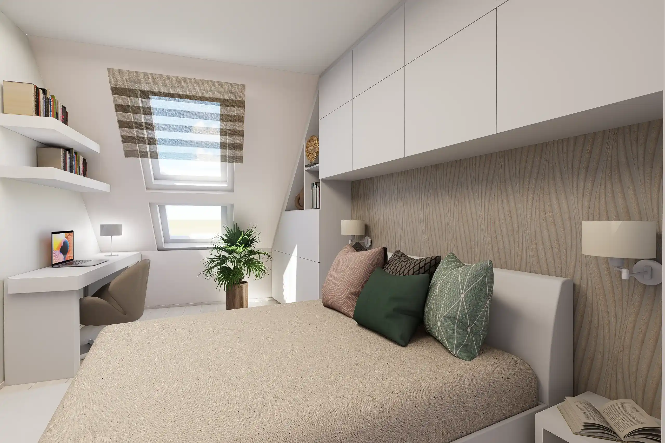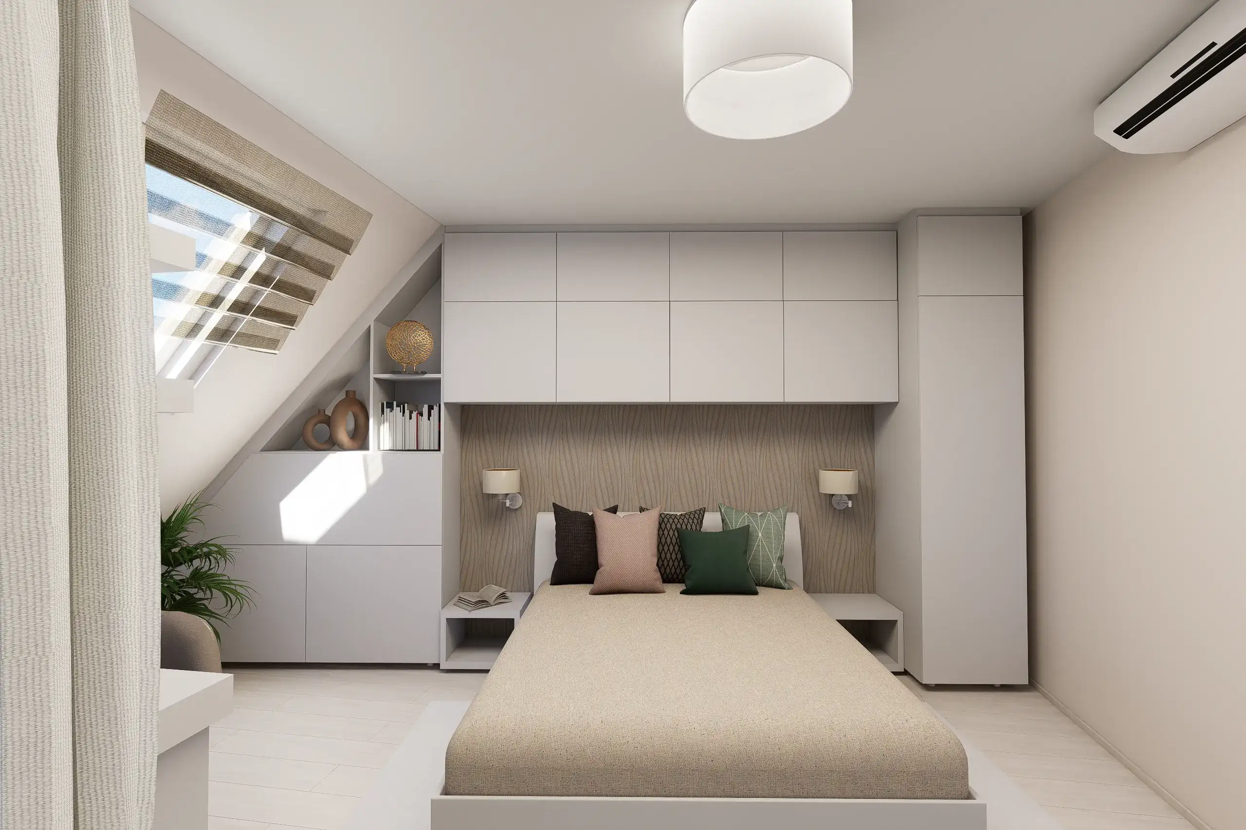 Megrendelőm tetőtéri lakásában a kérés a világos tónusú textúrák mellett az elegendő tárolótér kialakítása volt, esztétikusan. A tetőtéri adottságok és a csapott falsíkok tudatos térszervezést igényelnek. Igény volt egy dolgozósarok kialakítására is, amely a hálószoba ablaka alatt kapott helyet a tökéletes fényviszonyok miatt.