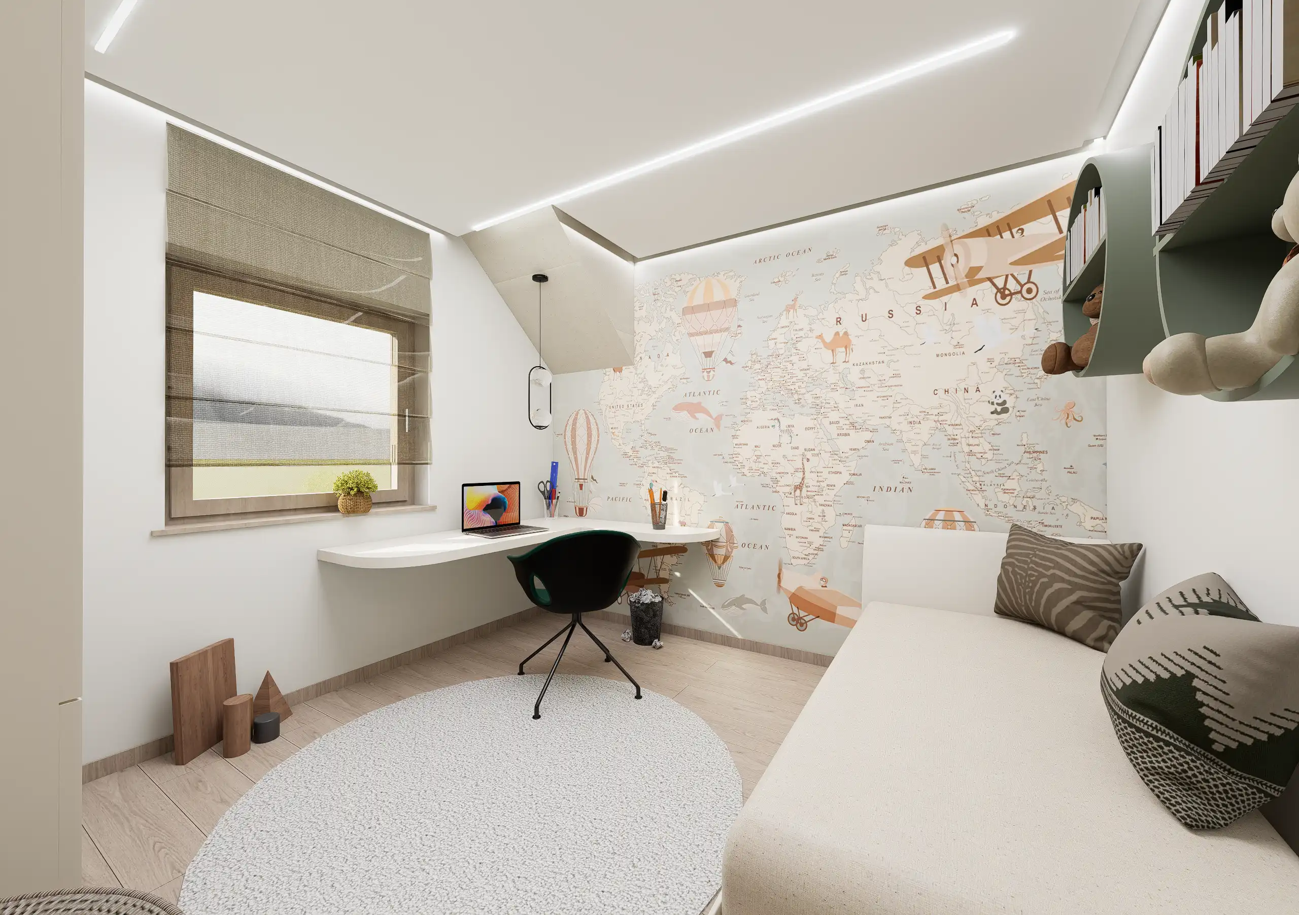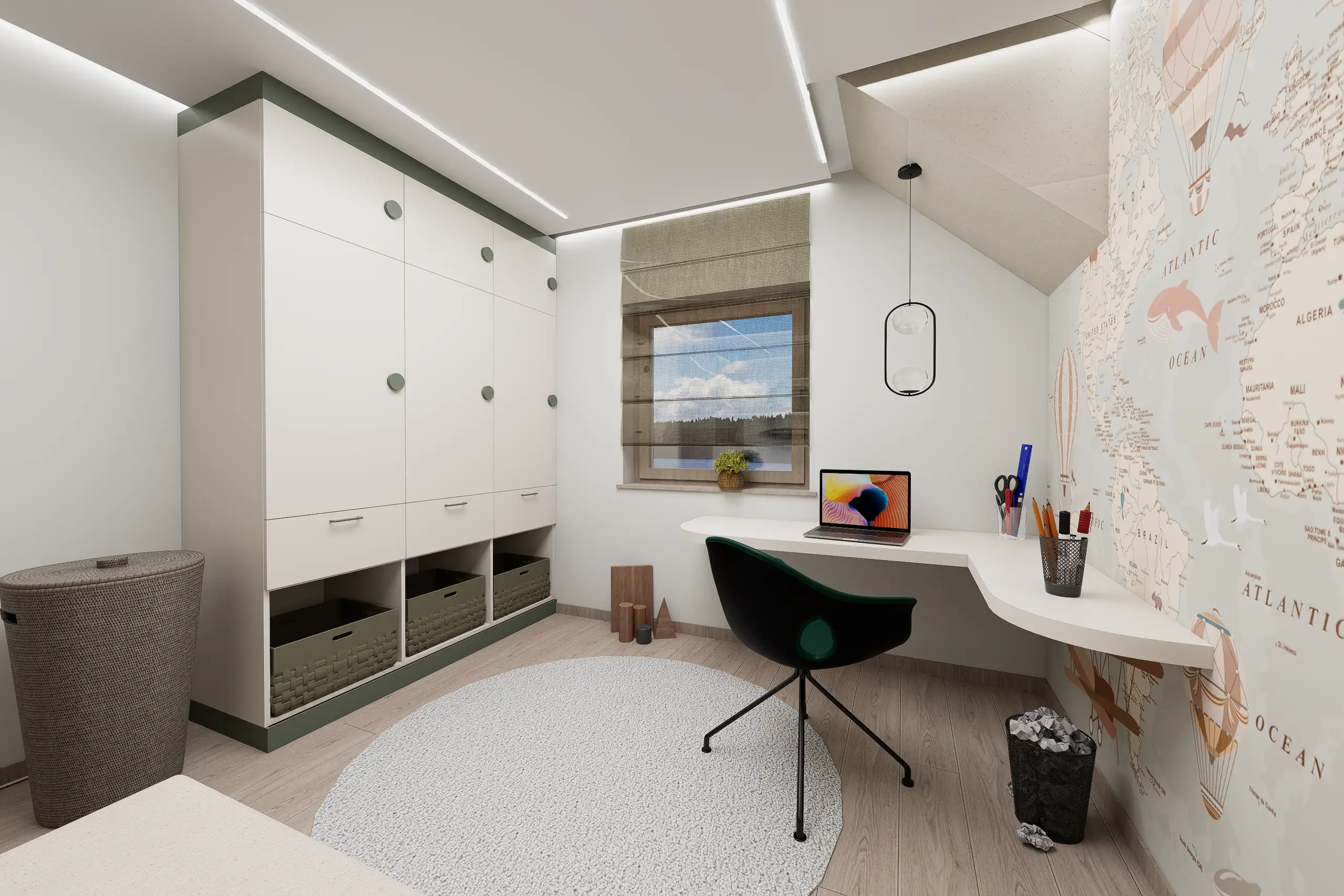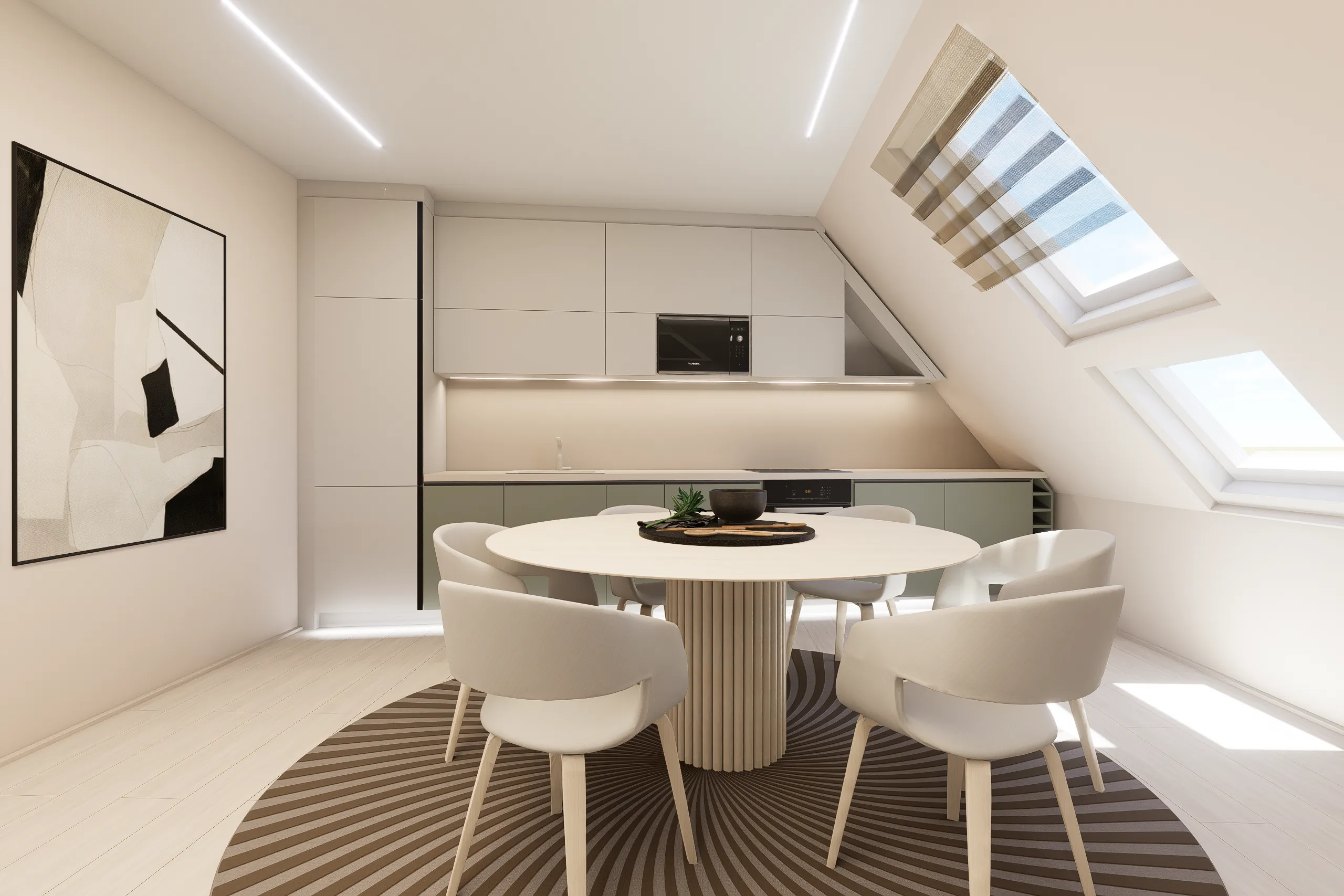 Megrendelőm tetőtéri lakásában a kérés a világos tónusú textúrák mellett az elegendő tárolótér kialakítása volt, esztétikusan. A tetőtéri adottságok és a csapott falsíkok tudatos térszervezést igényelnek. Igény volt egy dolgozósarok kialakítására is, amely a hálószoba ablaka alatt kapott helyet a tökéletes fényviszonyok miatt.