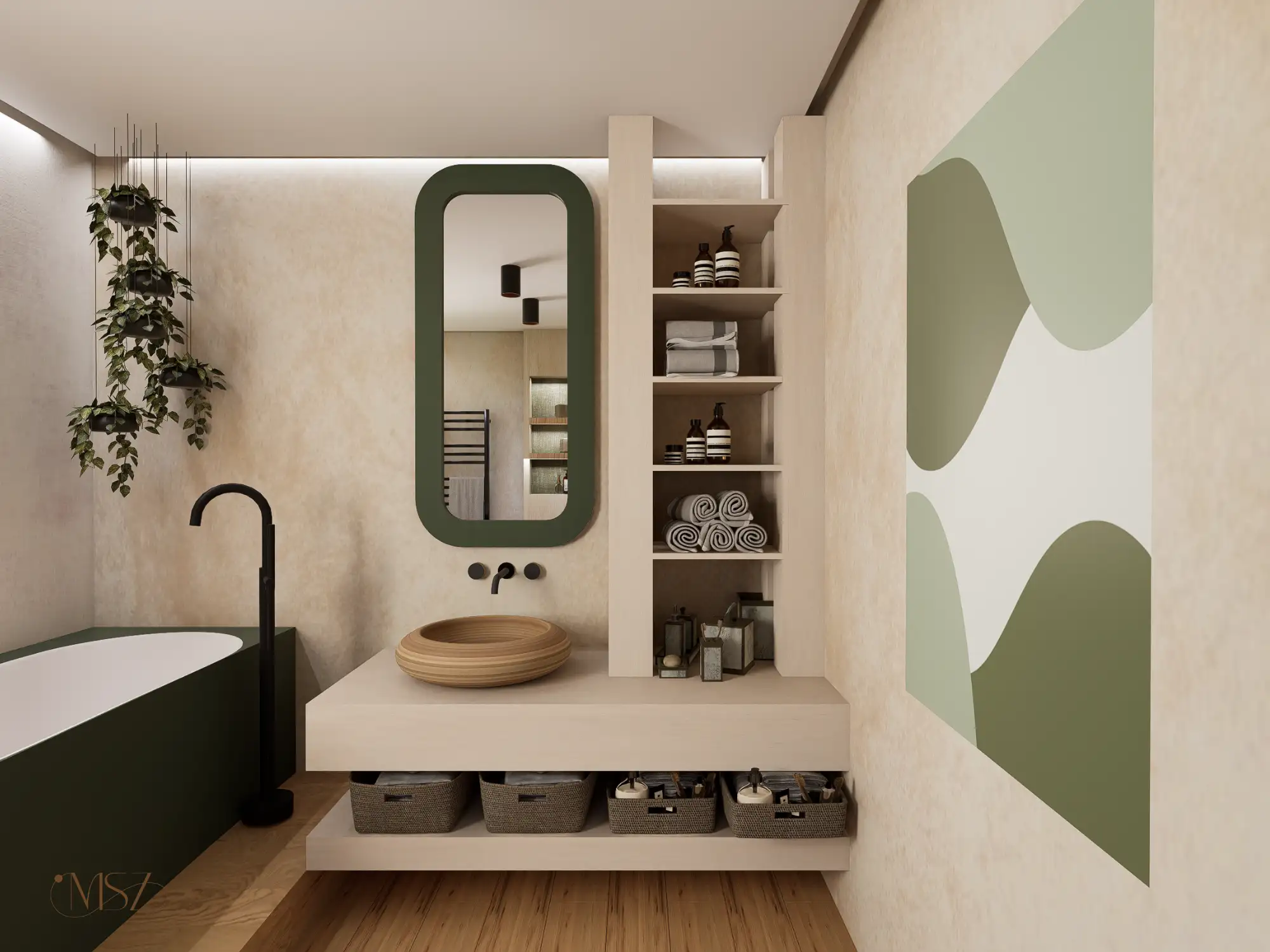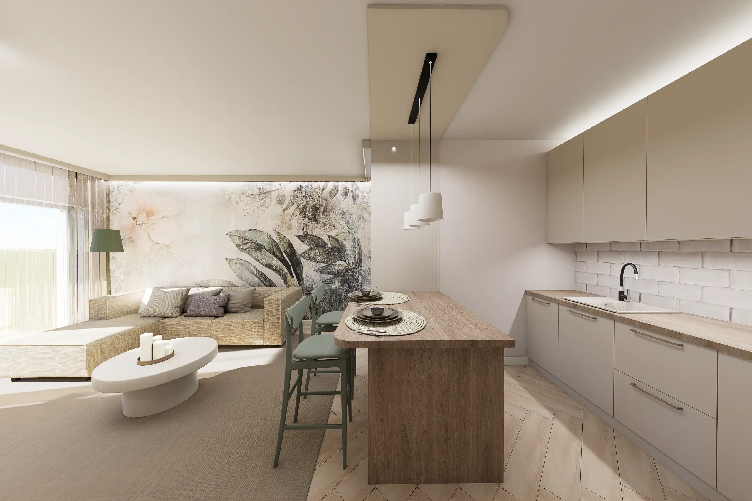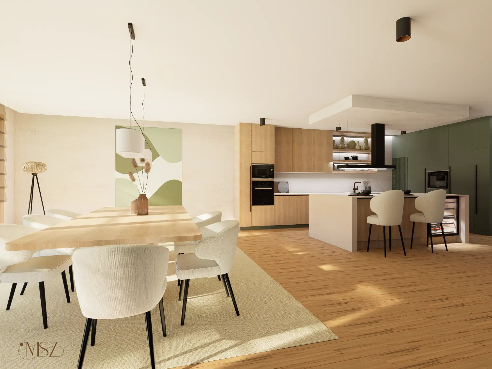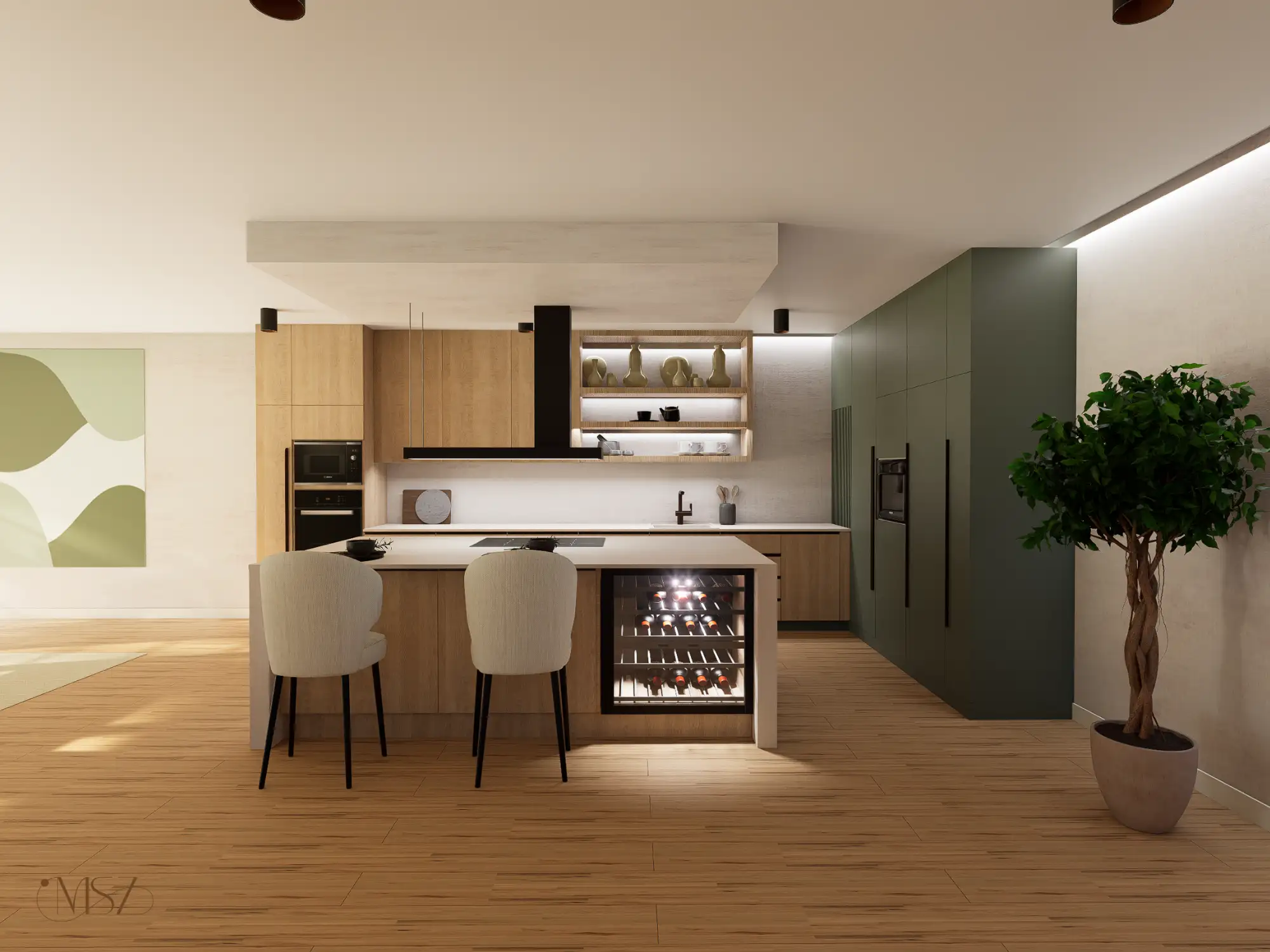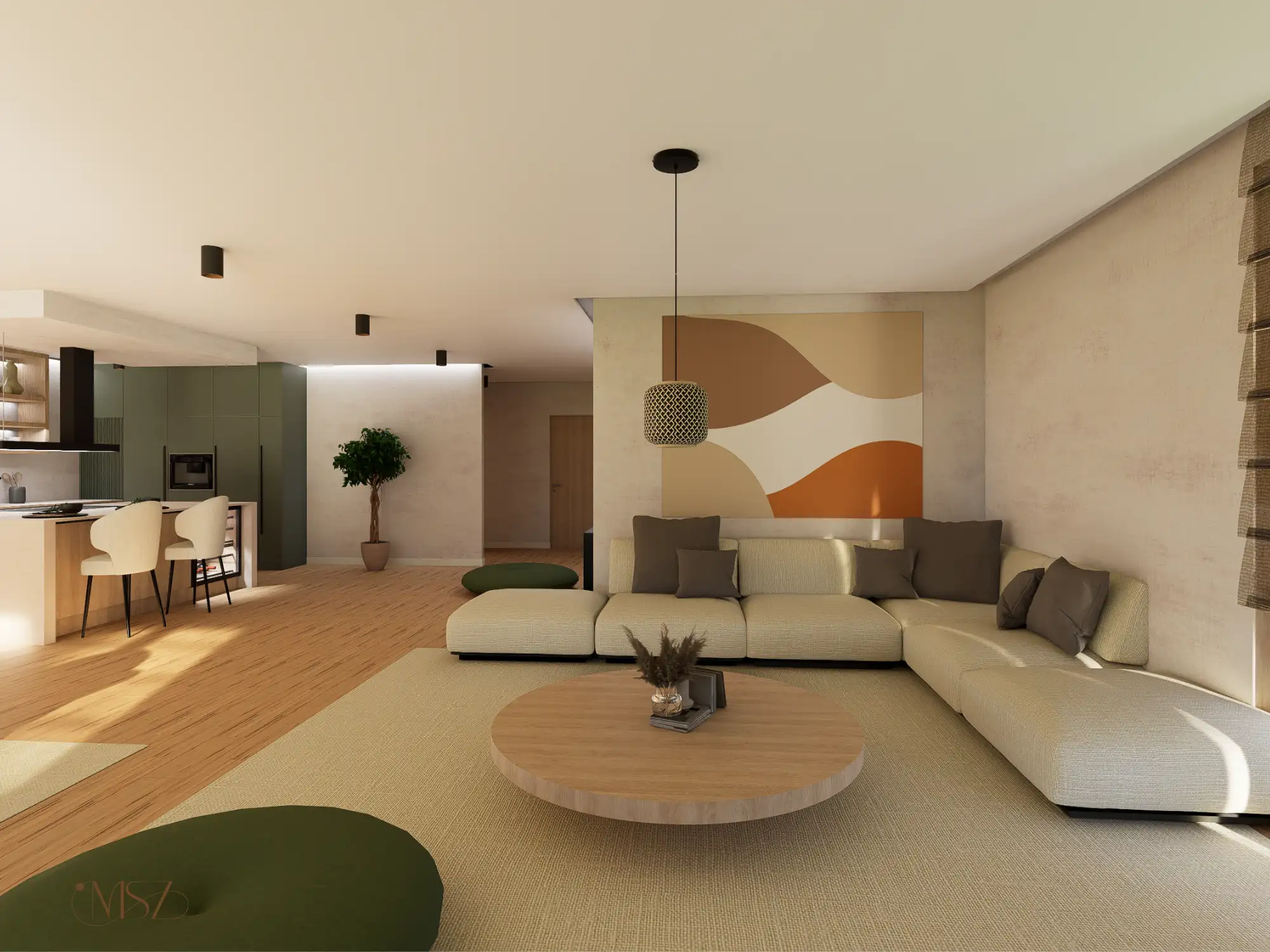 Ez a lakás, egy különleges Japandi stílusú enteriőr enyhe wabi-sabi érzülettel, természetes anyagokkal és nyugodt, harmonikus térszervezéssel. Alacsony, horizontális bútorarányok, természetes anyagdominancia – fa, textúrált falak, len és kőhatás. Földszín alapú színpaletta zöld hangsúllyal. Mindez pihentető otthoni atmoszférát teremt.