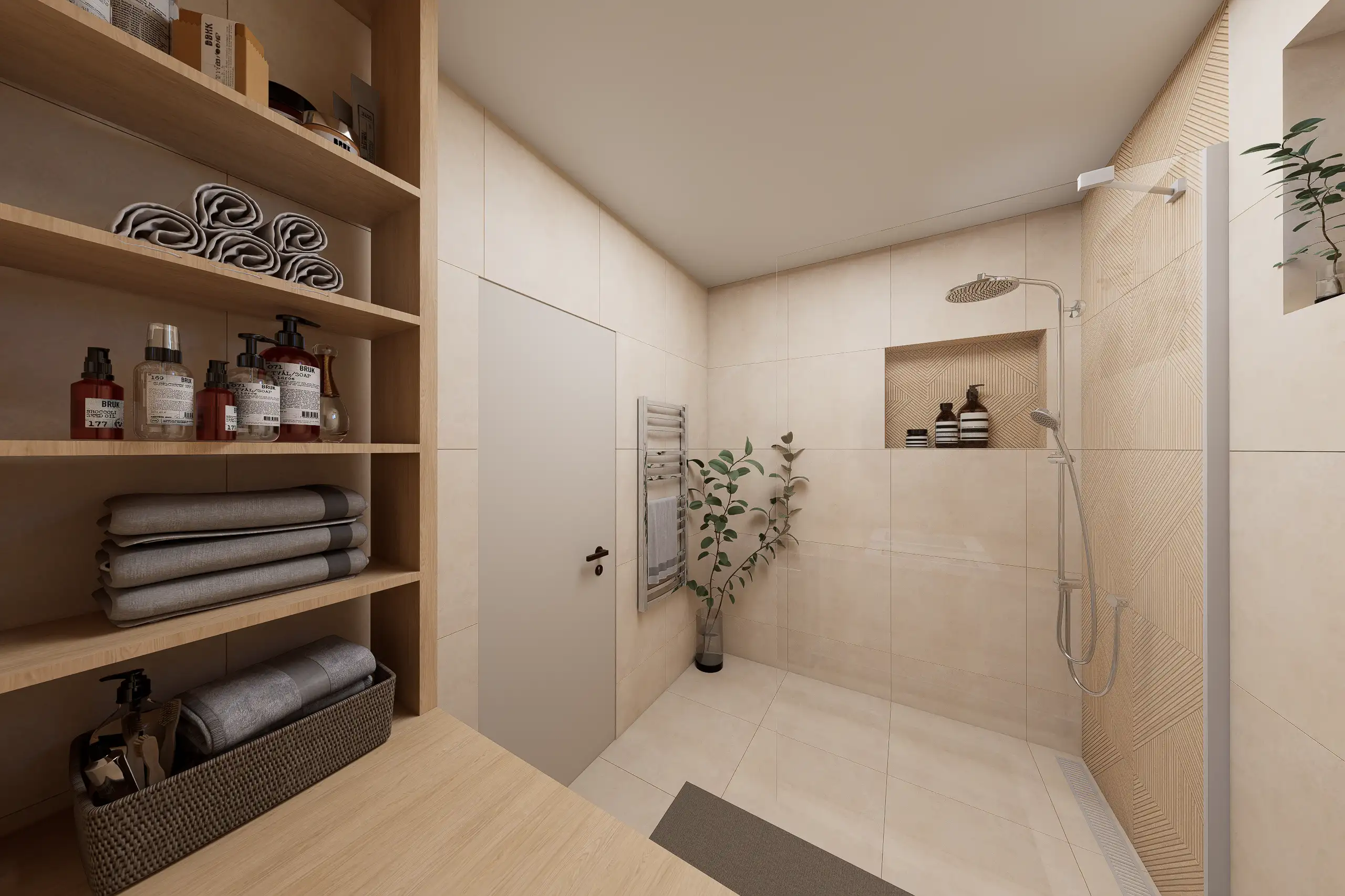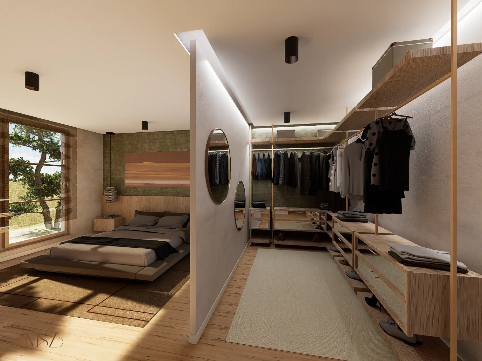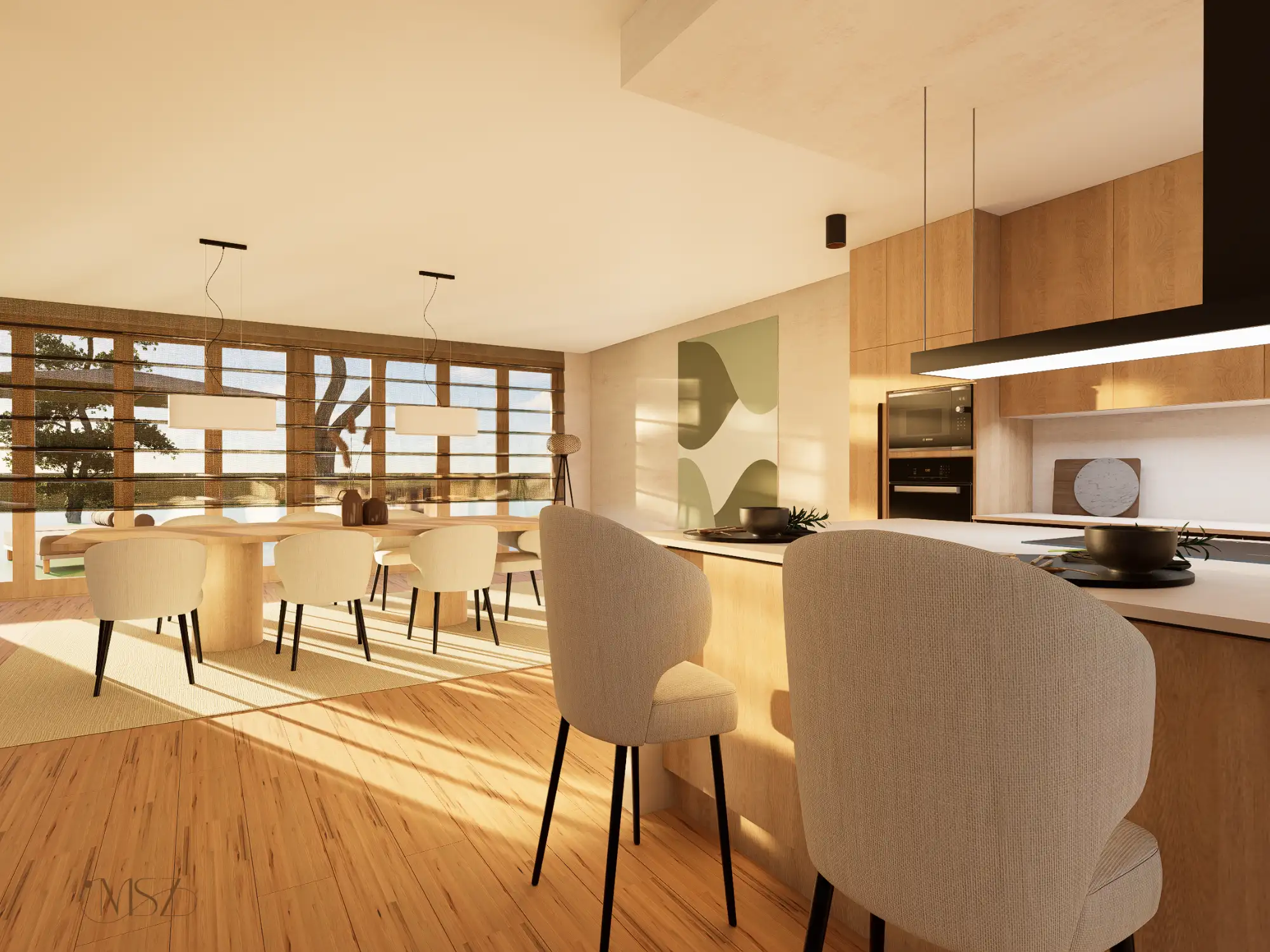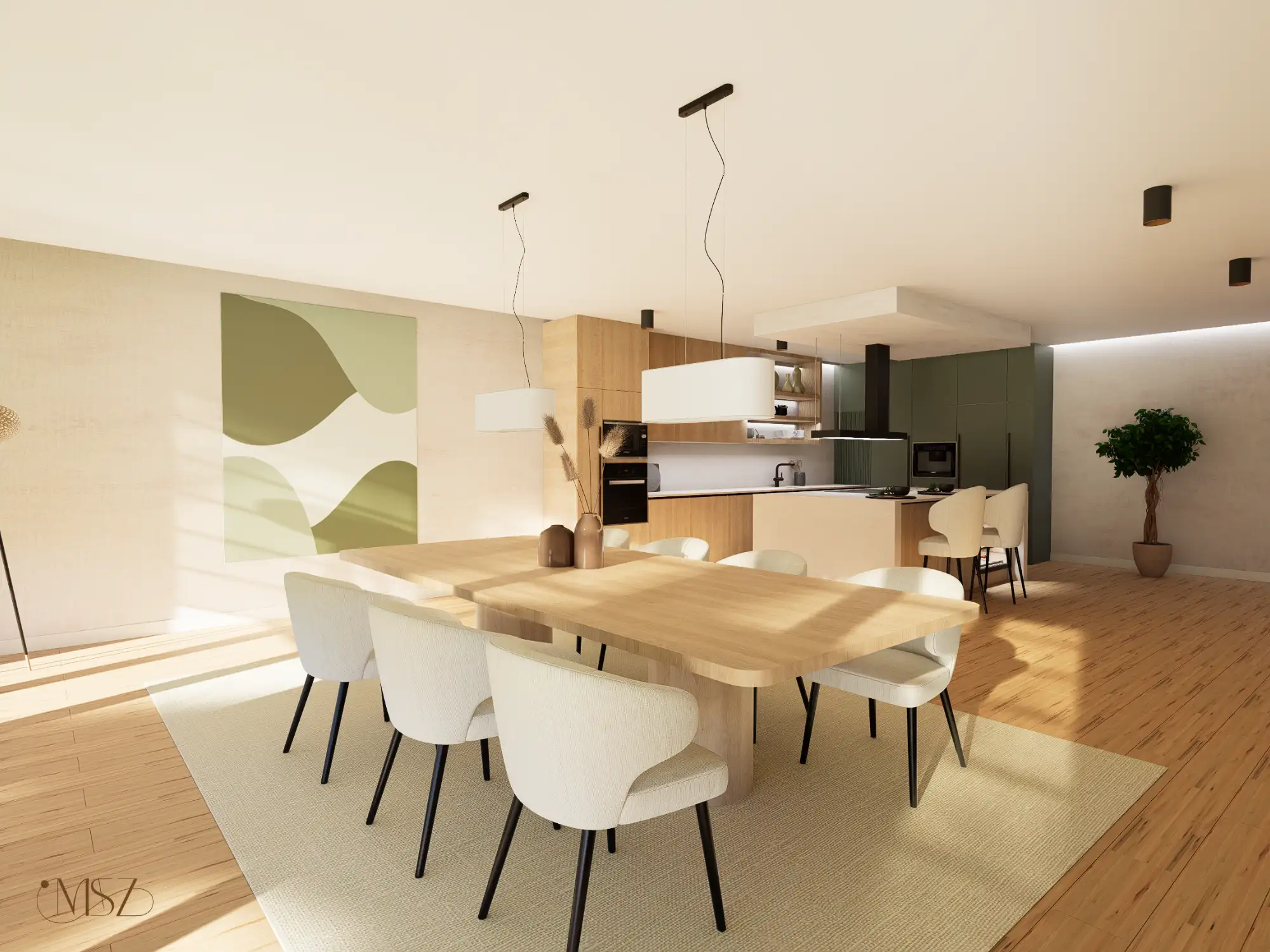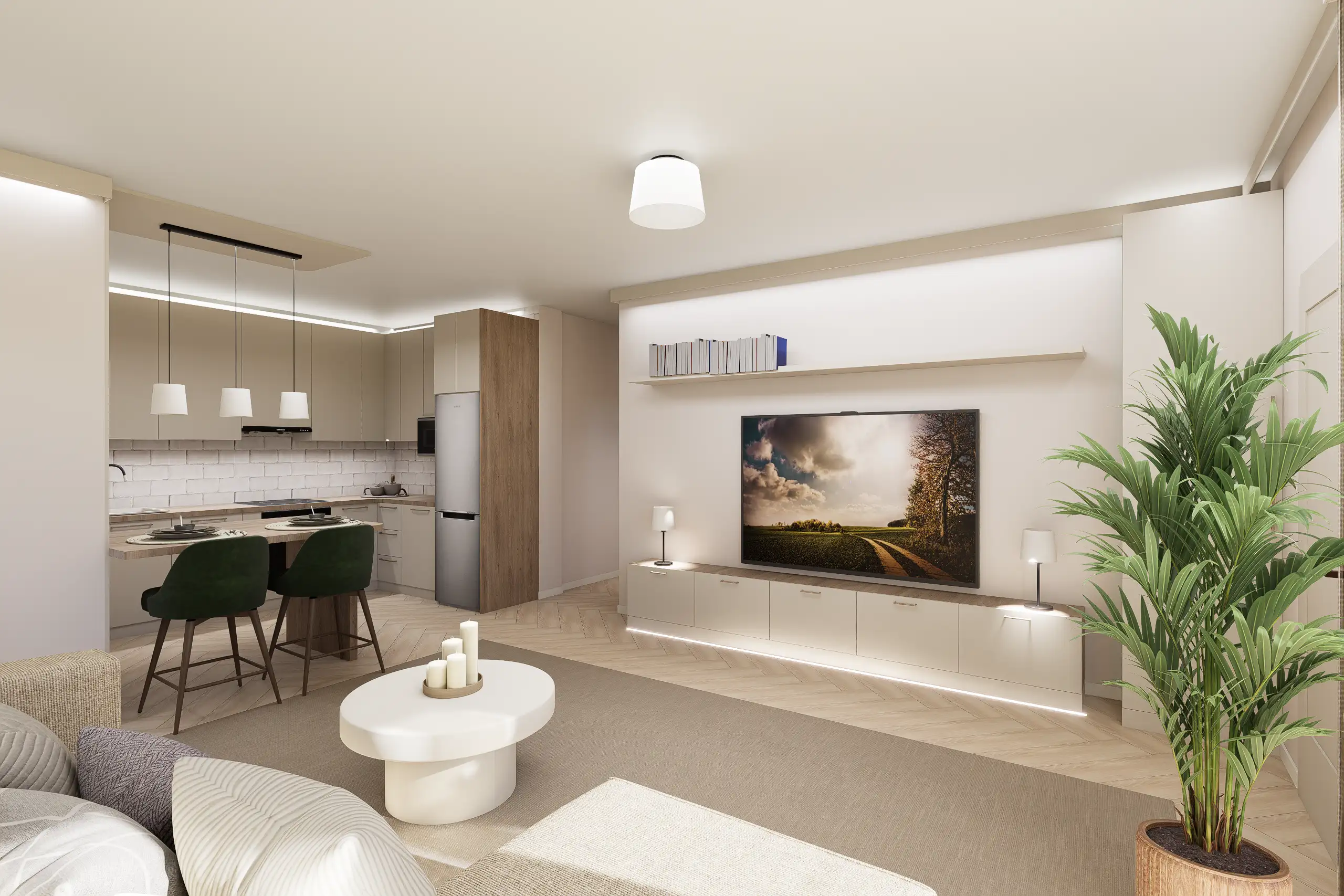 Ez a lakás, egy különleges Japandi stílusú enteriőr enyhe wabi-sabi érzülettel, természetes anyagokkal és nyugodt, harmonikus térszervezéssel. Alacsony, horizontális bútorarányok, természetes anyagdominancia – fa, textúrált falak, len és kőhatás. Földszín alapú színpaletta zöld hangsúllyal. Mindez pihentető otthoni atmoszférát teremt.