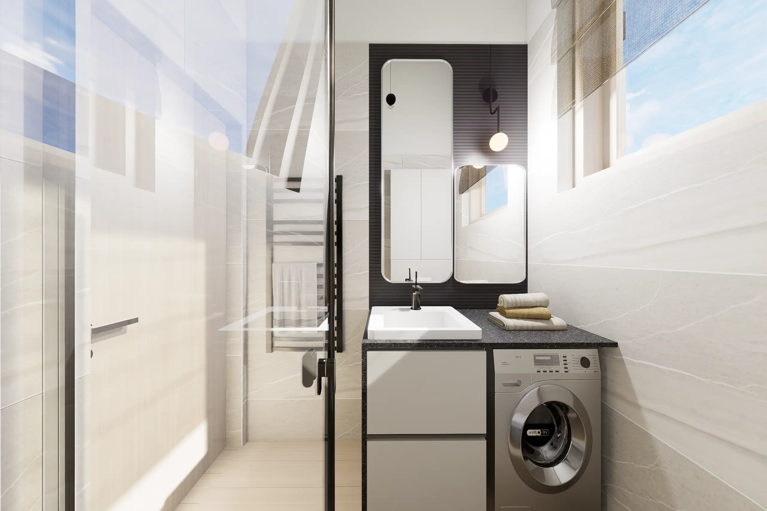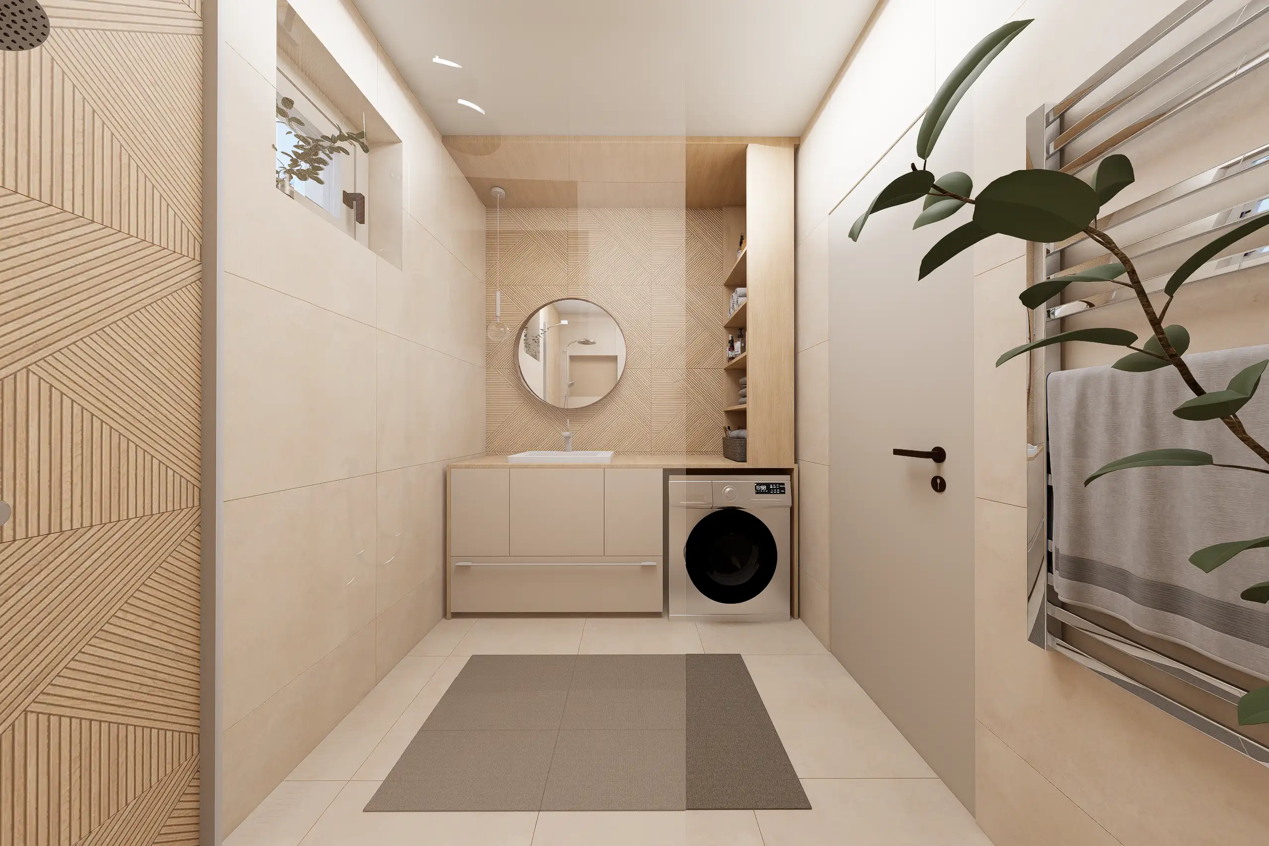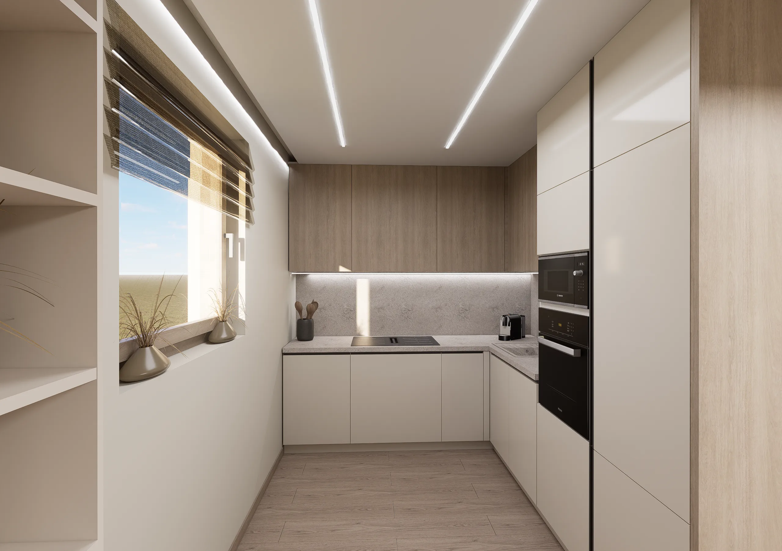 A kérés ebben az esetben egy jó hangulatú, praktikus otthon megteremtése volt. Ennek alapján született meg ez a terv, világos anyagokkal, finom földszínekkel és egyedileg tervezett bútorokkal a maximális térkihasználás érdekében.